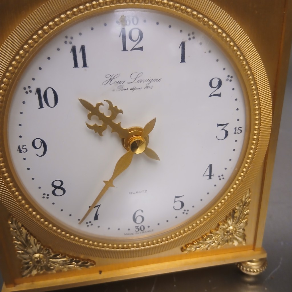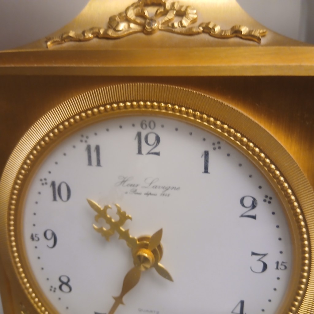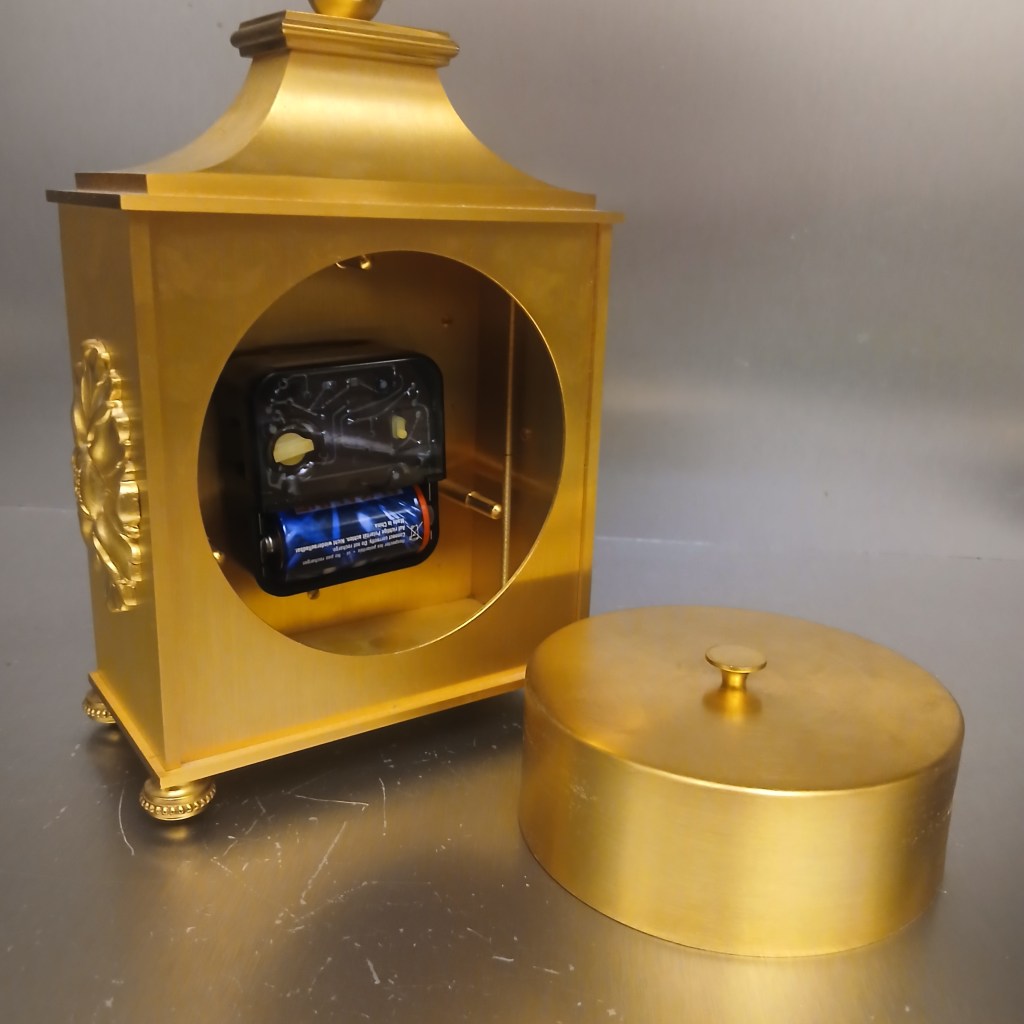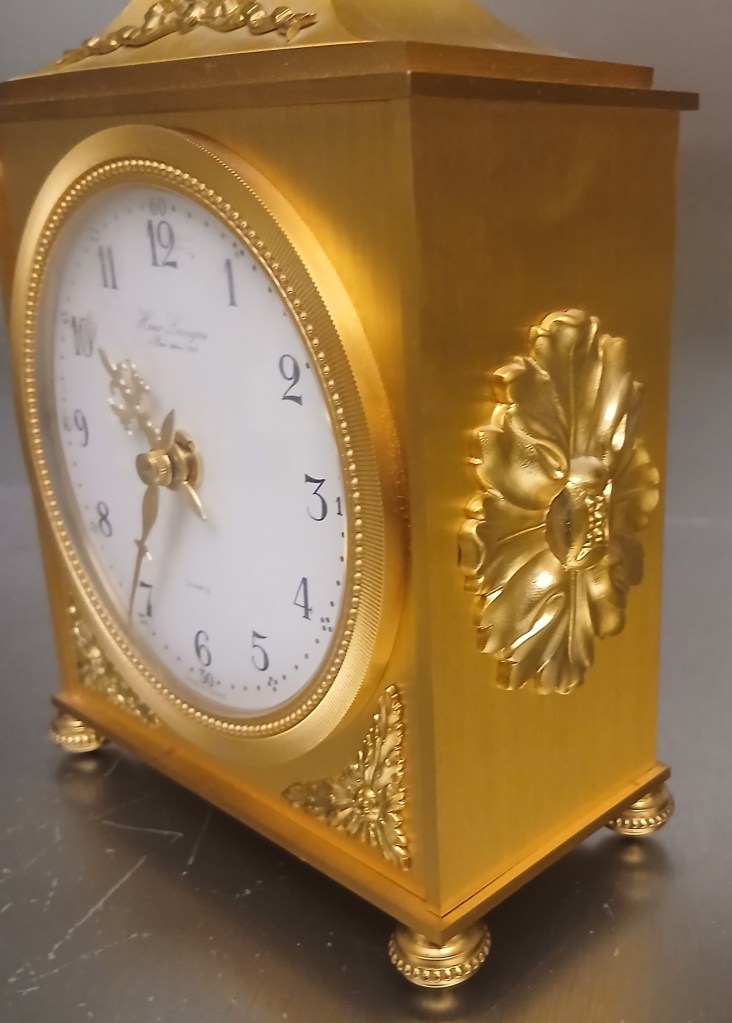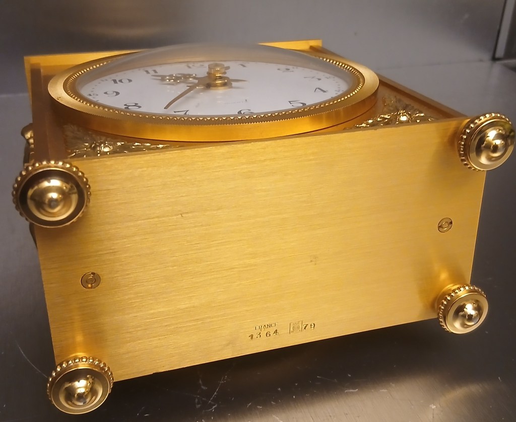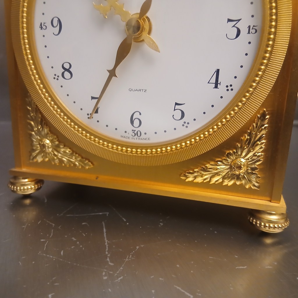 Horloge à poser , 70.1364 , corps en bronze doré, bélière fixe , aiguilles dorées , chiffres arabes sur cadran blanc , mouvement à quartz , à pile LR14 , Made in France , hauteur 25,5 cm en haut de la bélière, largeur 14,5 cm, poids 2,415 kg avec la pile . Voir la version mécanique .