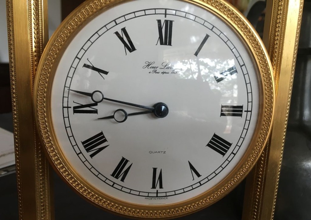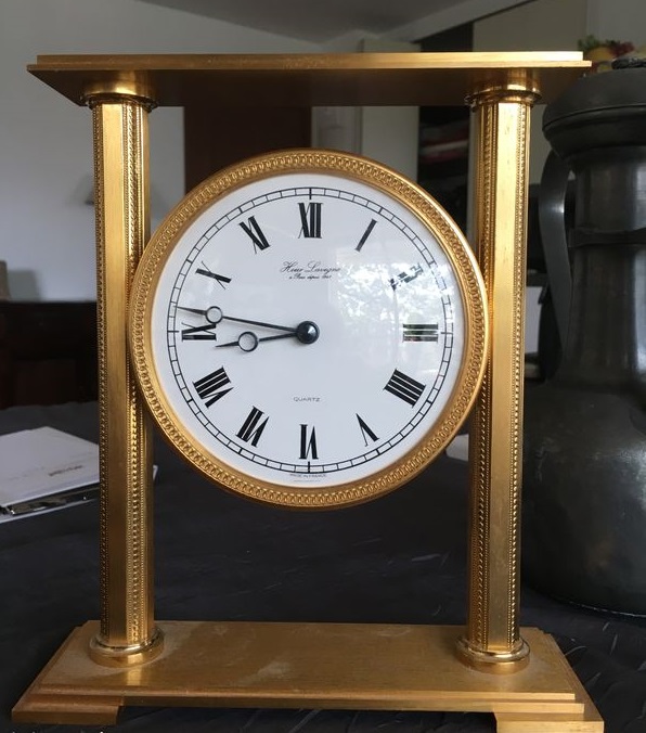 HOUR LAVIGNE à Paris depuis 1848 , horloge portique à poser , 70.1337 , à deux colonnes carrées , aiguilles Breguet noires , chiffres romains sur cadran blanc avec chemin de fer au pourtour ,mention France en bas de cadran. , mouvement à quartz , à pile LR6 , hauteur 24 cm .