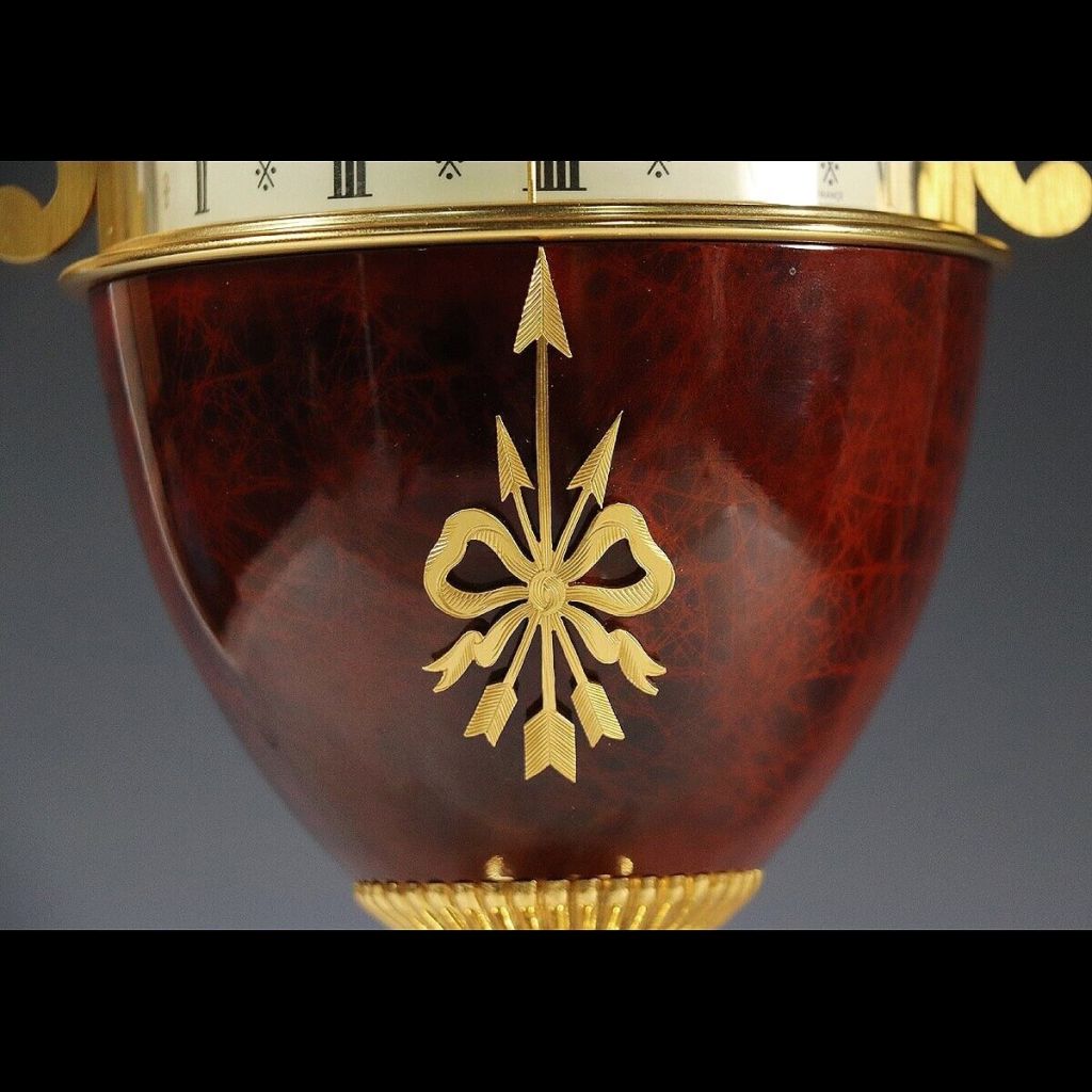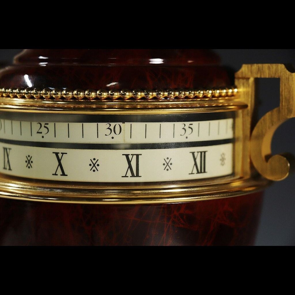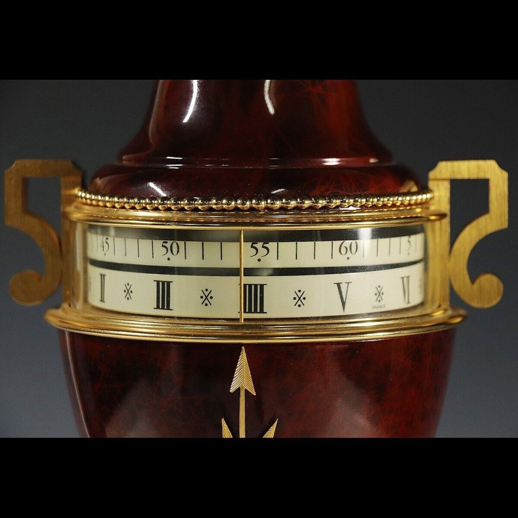 Horloge à poser , référencé 70.1257 puis 70 1257 A35 , urne bleue façon lapis lazuli , bronzes doré à l’or fin 24 carats , chiffres romains , deux disques : un pour les heures et l’autre pour les minutes , socle en marbre blanc de Carrare ( Italie) , hauteur 33 cm , poids 4,1 kg ; mouvement à quartz , nommée LE VASE par Hour Lavigne dans son catalogue 1995 .