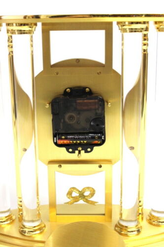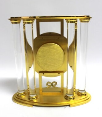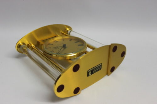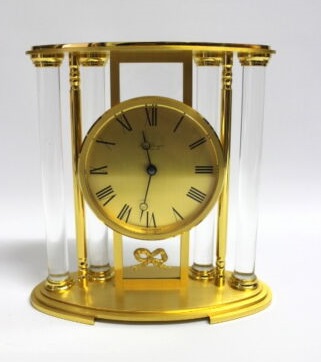 Horloge à poser , forme portique , quatre colonnes en Altuglas , aiguilles Breguet noires , mouvement à quartz , à pile , cadran doré chiffres romains , mention Made in France , largeur en haut 22 cm , largeur en bas 24 cm , profondeur au dessus 9 cm , profondeur en bas 10 cm , hauteur 24 cm , poids 4.268 gr . Il en existe une version estampillée LANCEL ,dont Hour Lavigne était un fournisseur habituel ;