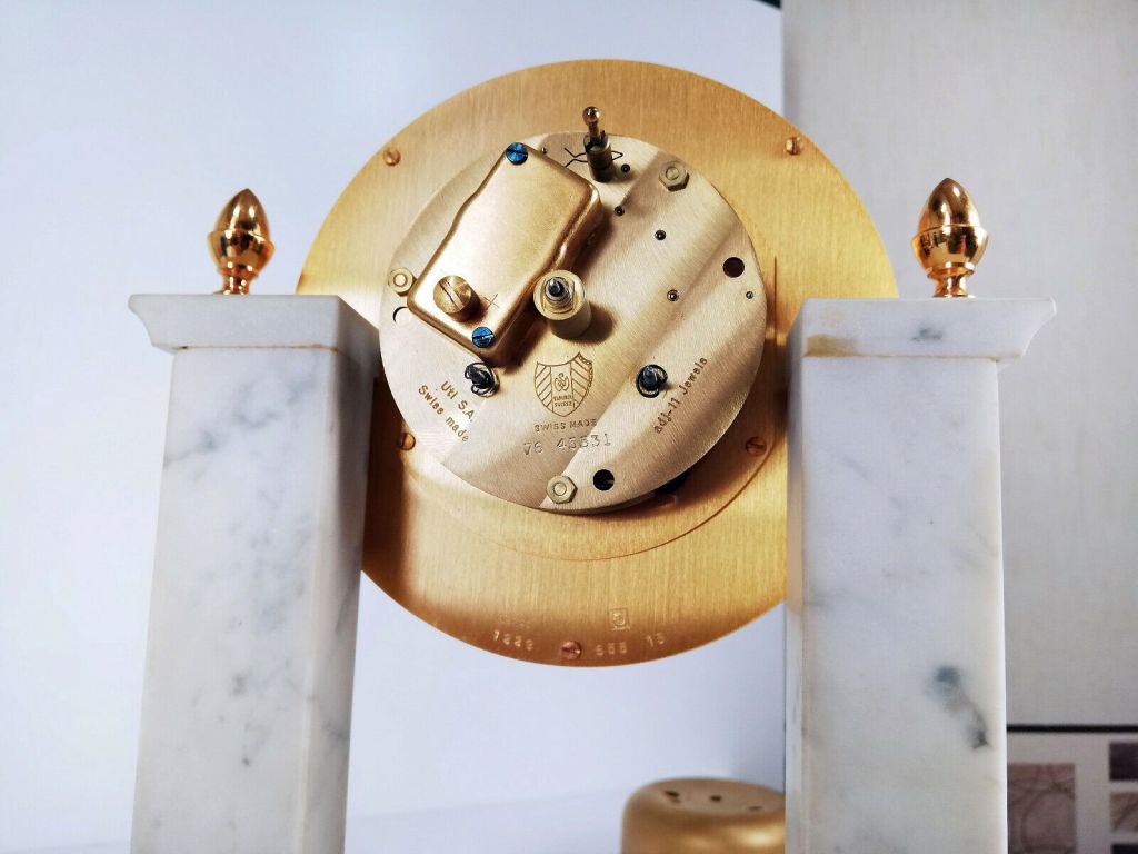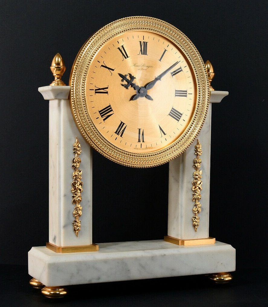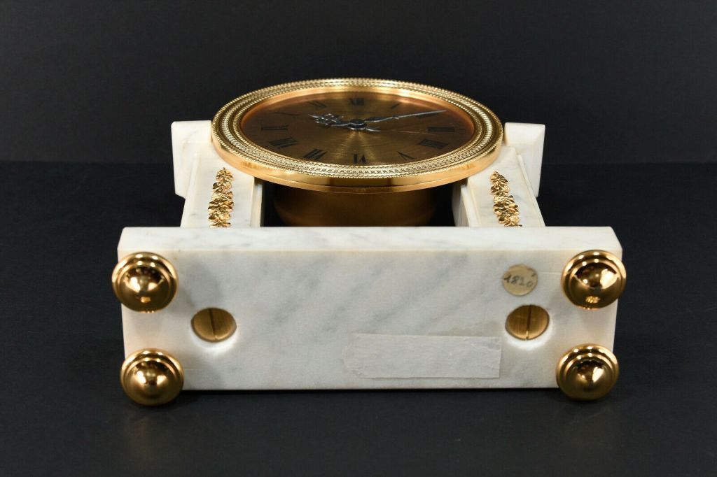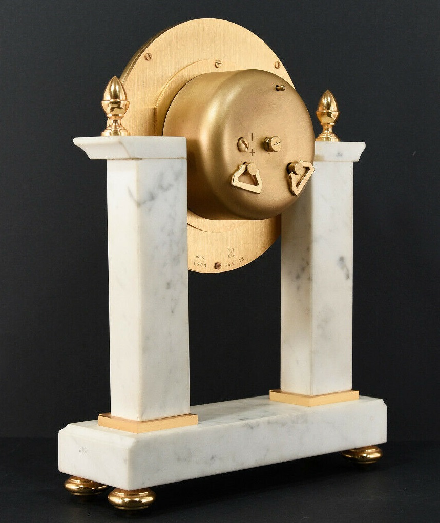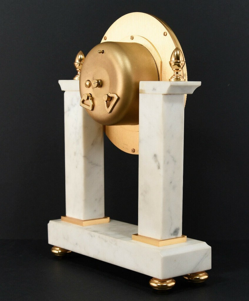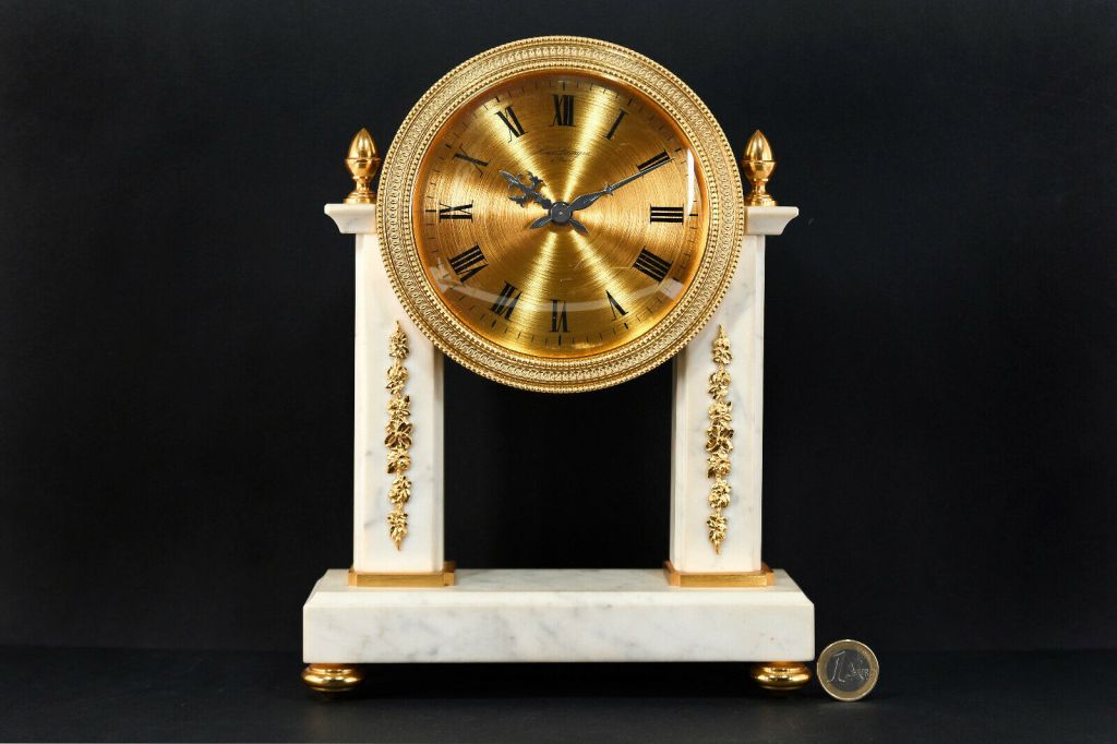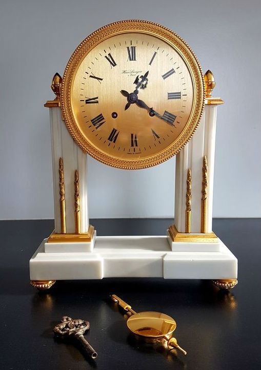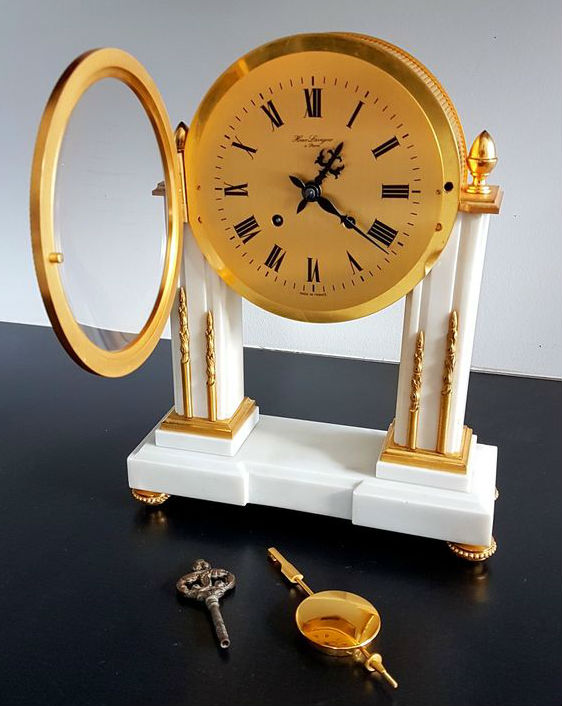 Pendule à poser en marbre et laiton massif doré à l’or fin , deux colonnes carrées de marbre blanc , chiffres romains sur cadran doré , aiguilles noires , mouvement mécanique par UTI , 11 jewels , clef amovible , balancier , sonne les heures et demies, mention Made in France . Dimensions : Hauteur 26cm / Largeur 19cm / Profondeur 6cm / Poids 2,9kg . Voir plus bas variante à balancier. Voir la version en bois .