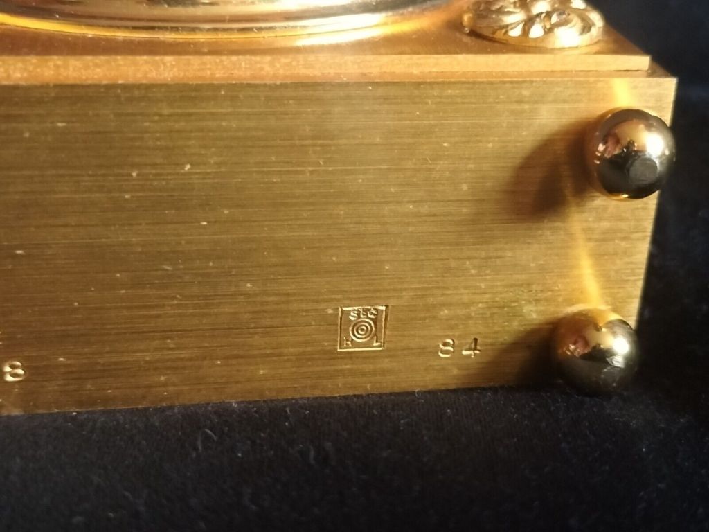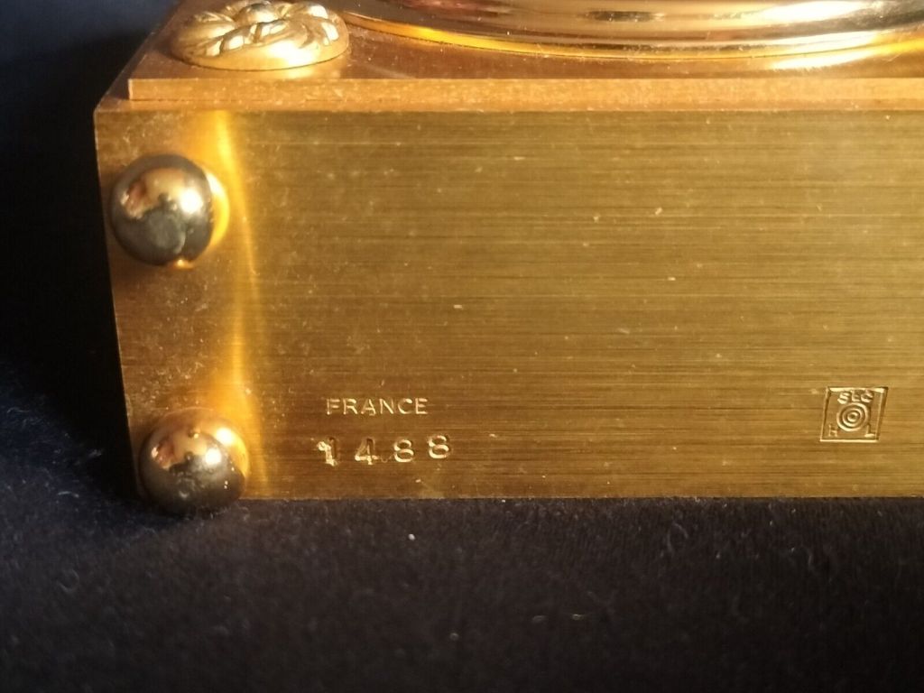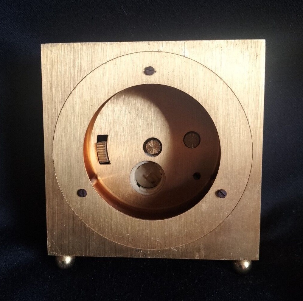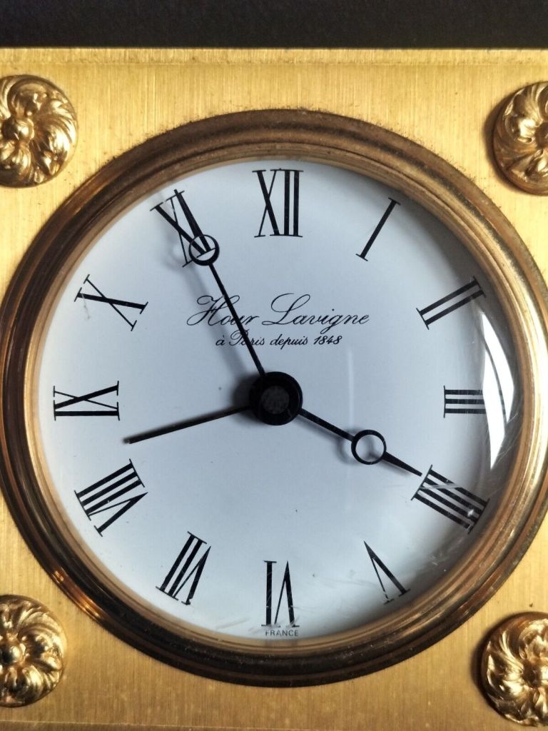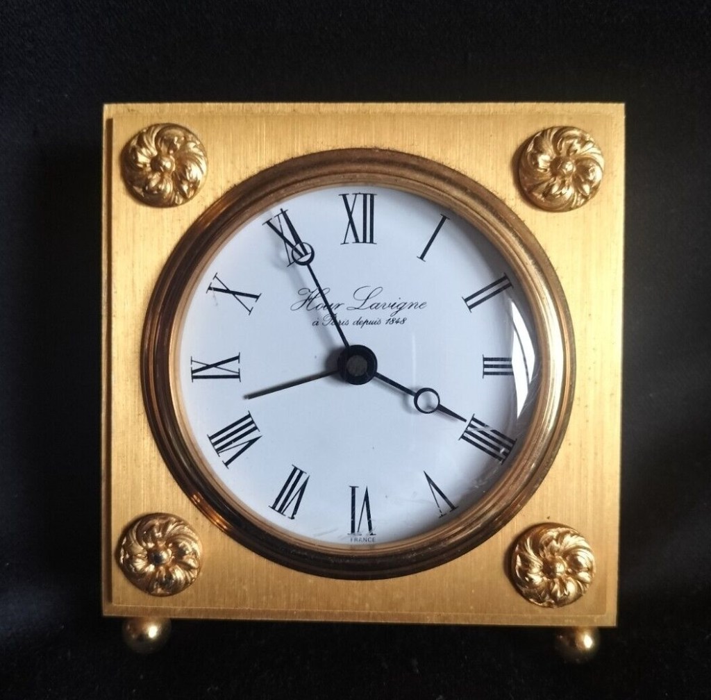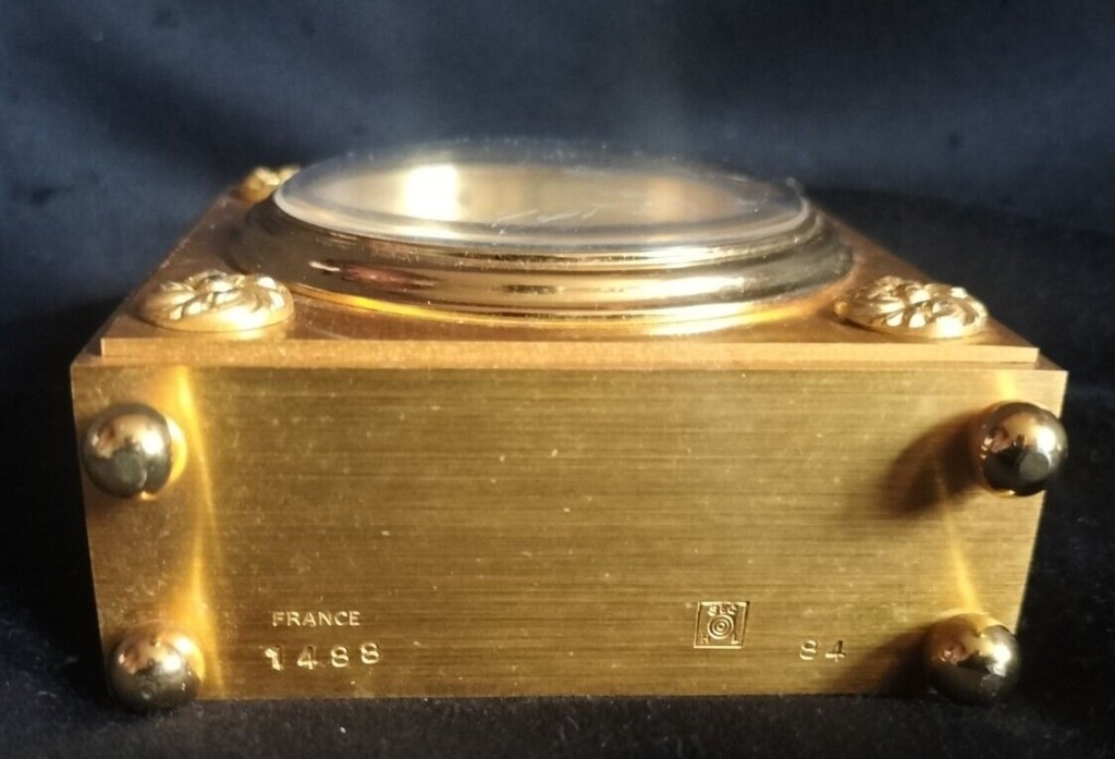 Réveil carré , en laiton doré , aiguilles Breguet noires , mention France en bas du cadran blanc , chiffres romains , mouvement à quartz , à pile bouton, format 8,5 x 8,5 cm