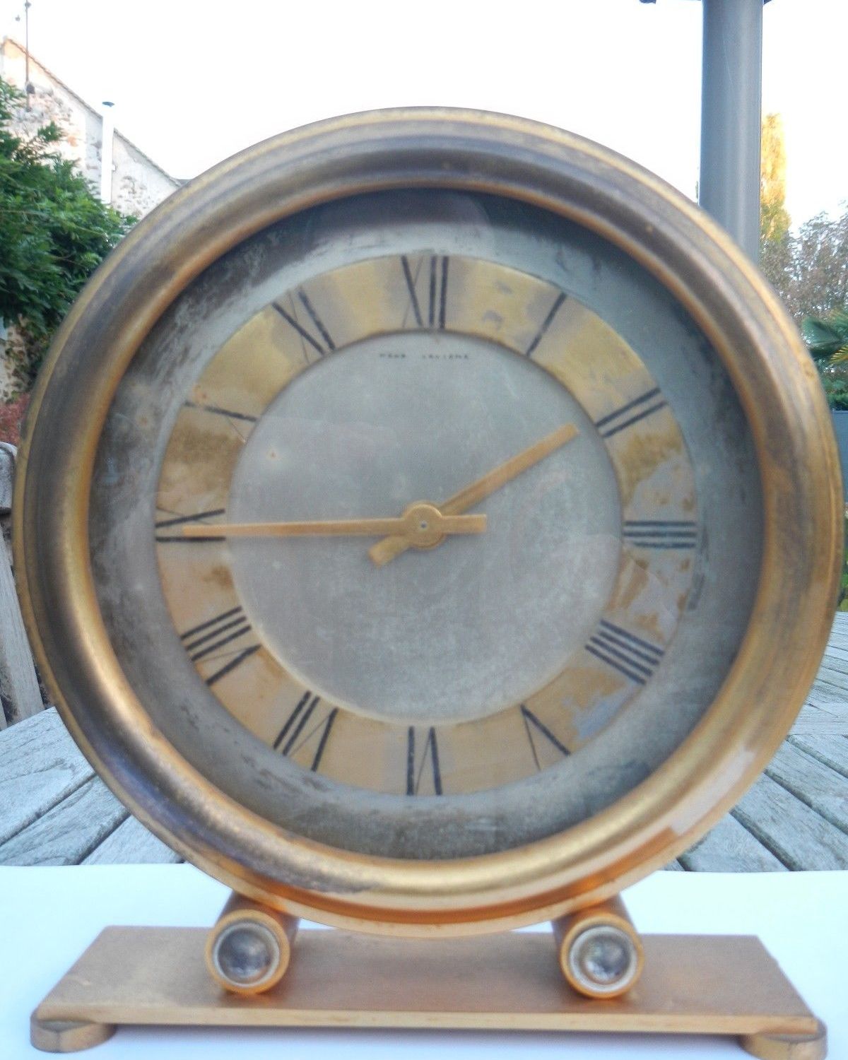Pendule à poser ronde , sur socle , chiffres romains , aiguilles dorées , style Art Deco .Mouvement mécanique par Angelus , 15 rubis , Hauteur: 20 cm Diamètre: 18 cm Poids: 1,680 kg