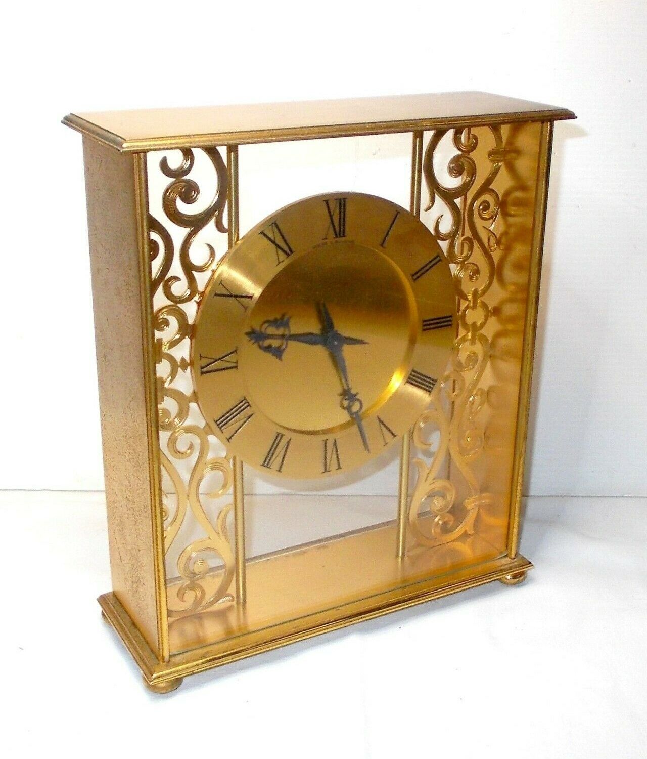 Horloge rectangulaire , à décor de volutes gothiques sur deux panneaux , aiguilles noires , chiffres romains sur disque doré , cadran doré , mouvement mécanique , vitre en verre , hauteur 245 mm , largeur 210 mm , épaisseur 75 mm , poids 3,8 kg .
