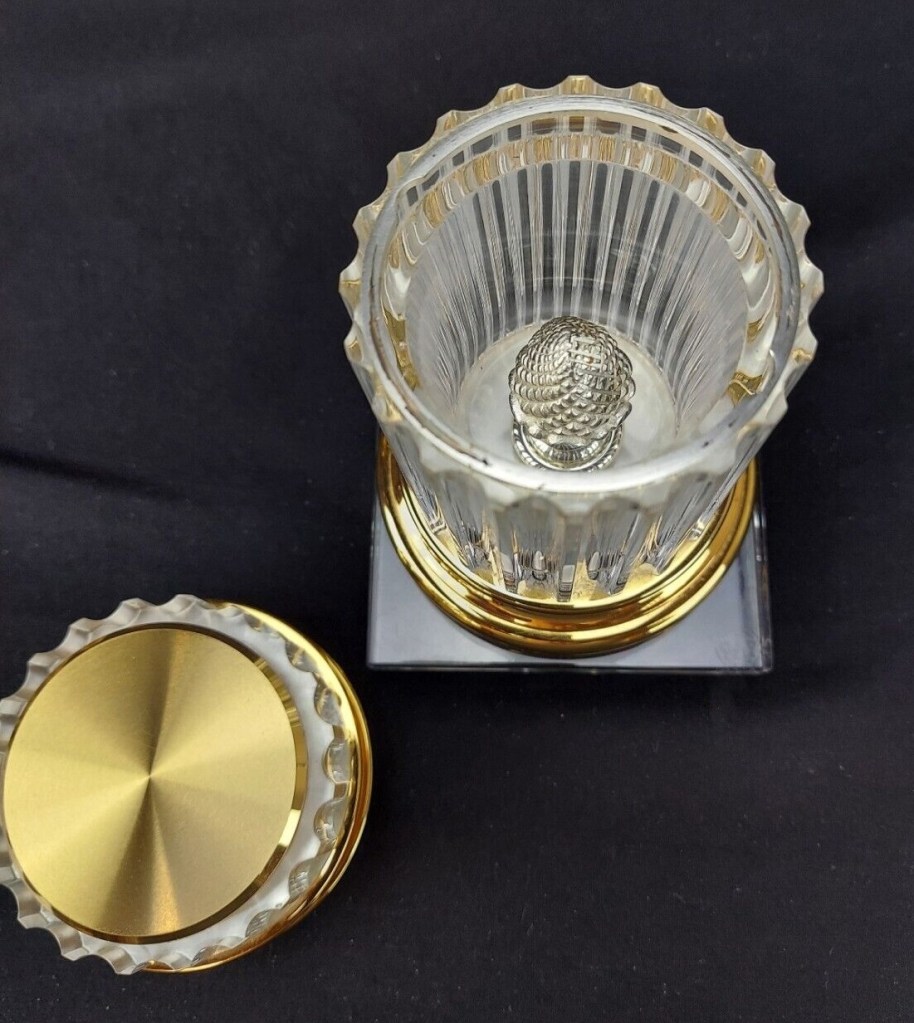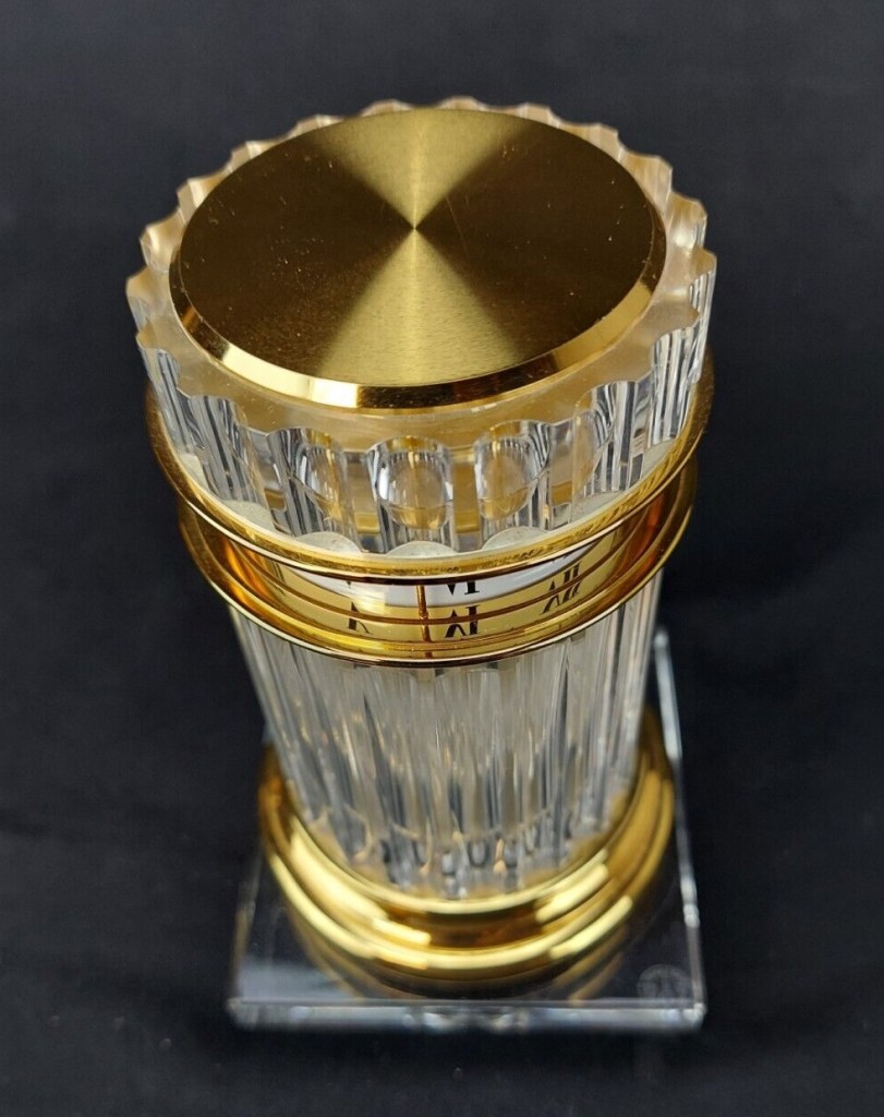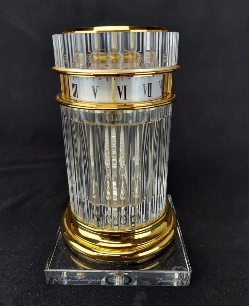 Grande colonne cristal de Baccarat , socle cristal , laiton plaqué or 24 carats , chiffres romains , référence 70 1626 A3P , mouvement quartz à pile , hauteur 25 cm , 10 inches . Existe avec un socle noir .