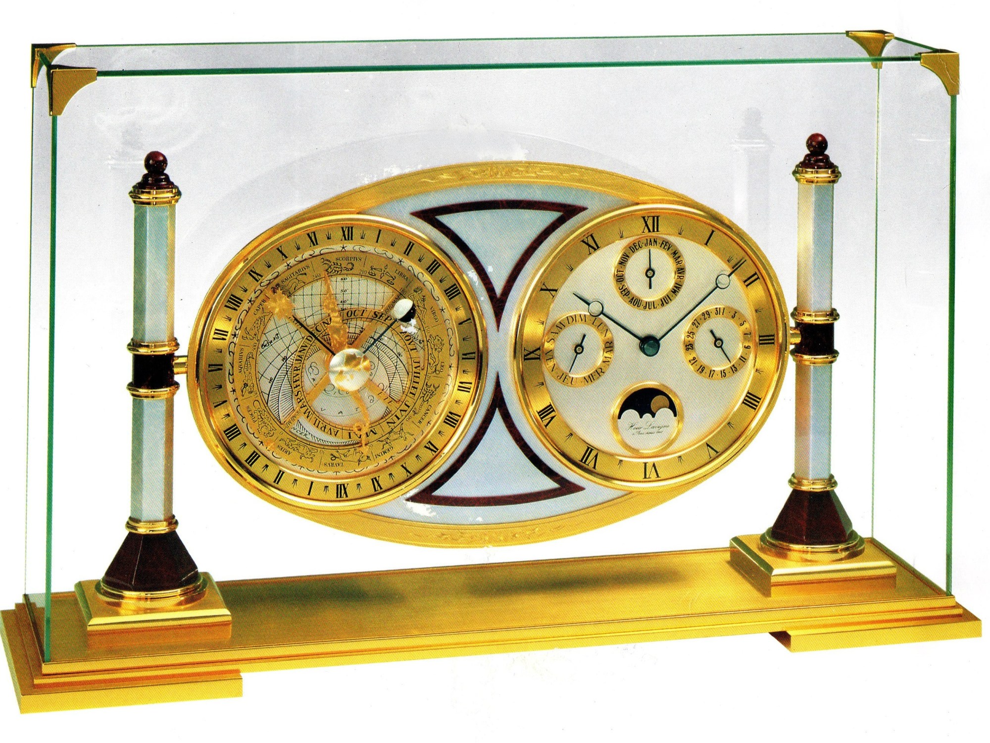 Horloge à poser sous cage de verre , astrolabe, sous forme de psyché , deux colonnes laque grise et façon marbre bordeaux , référence 70 1616 A31 , dateur à date jour et mois , quantièmes de lune , heure sidérale et solaire , zodiaque , laiton plaqué or 24 carats , aiguilles Breguet noires , mouvement quartz à pile .Hauteur 26 cm , 10,4 inches . Version quasi identique : variante de couleur bleu lapis-lazuli et variante marqueterie de nacre .
