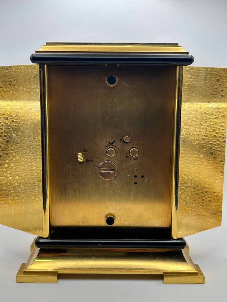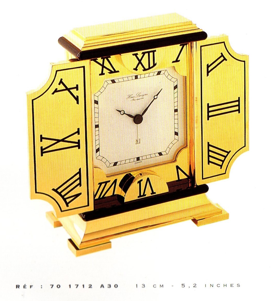 Grand réveil , cabinet à quatre portes , corps en laiton massif doré à l’or 24 carats , chiffres romains , aiguilles Breguet noires , mention France en bas de cadran , cadran blanc , chemin de fer octogonal au pourtour , quatre portes : deux devants , deux derrière , dateur à date sans jour , mouvement quartz à pile bouton , référence 70 1712 A30 , hauteur 13 cm , 5,2 inches , mention France en bas de cadran , sur socle.
