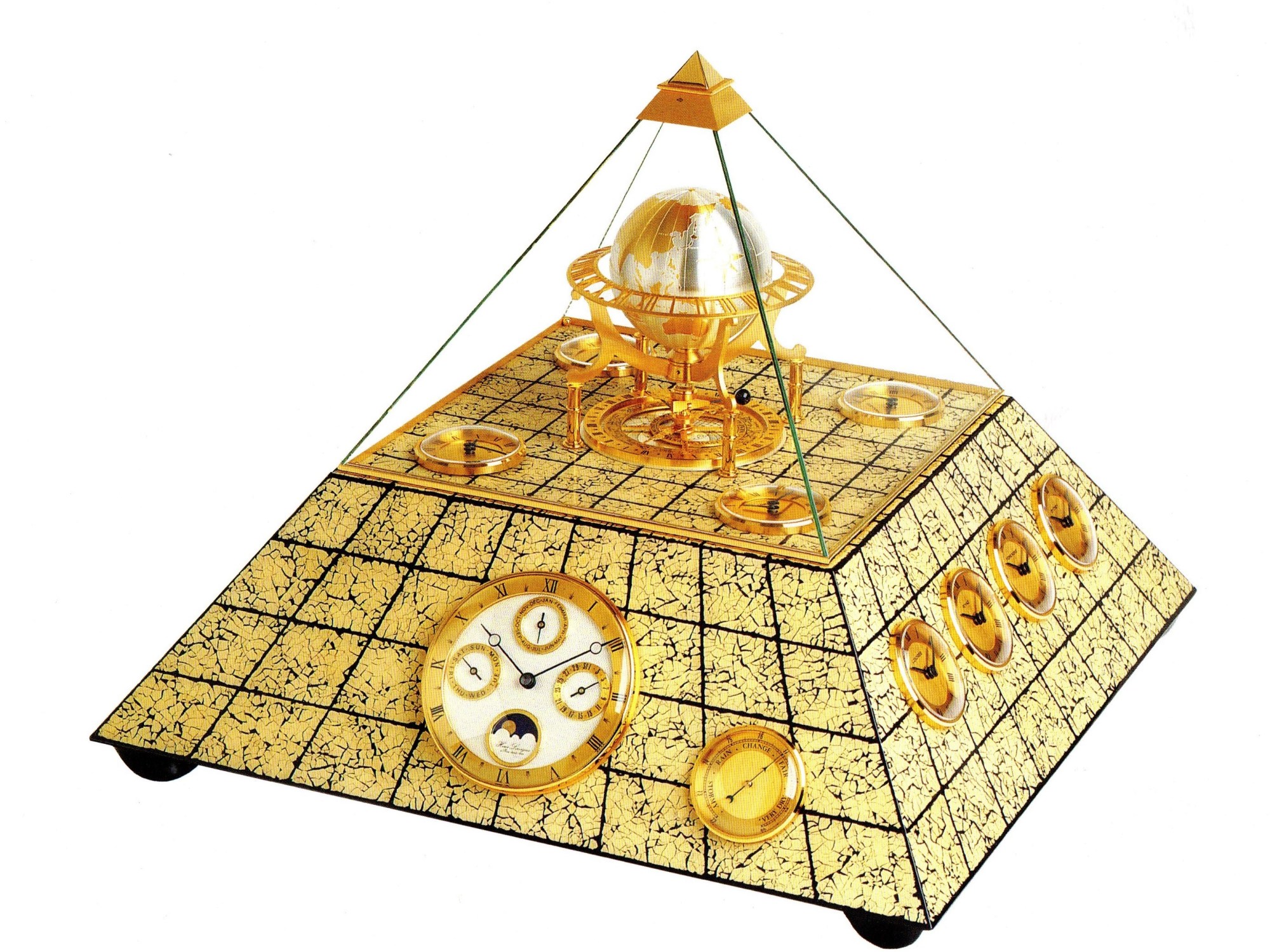 Grande pyramide , référence 70 1670 A30 N , astrolabe horizontal , globe terrestre , zodiaque , saisons , éclipses de lune et soleil , heure solaire et sidérale , dateur : date , jour et mois en trois cadrans , compendium : baromètre , thermomètre et hygromètre , aiguilles Breguet noires , chiffres romains sur disque doré , marqueterie de coquille d’oeufs : mouvement quartz à pile , laiton plaqué or 24 carats , hauteur 42 cm , 16,8 inches . Existe en marqueterie de pierres et gainé de galuchat vert. ou marqueterie de bois .