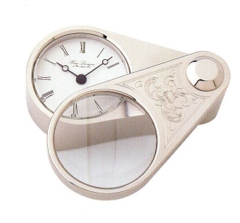 Loupes horloges de bureau , existe en plaqué or 4 carats ou plaqué argent ; Mouvement quartz à piles , chiffres romains sur cadran blanc , aiguilles breguet noires , référencées 70 1718 A30 pour la dorée et 70 1718 A38 pour l’argenté . Longueur 11 cm ou 4,4 inches