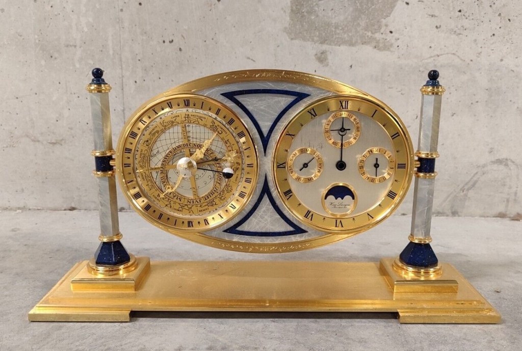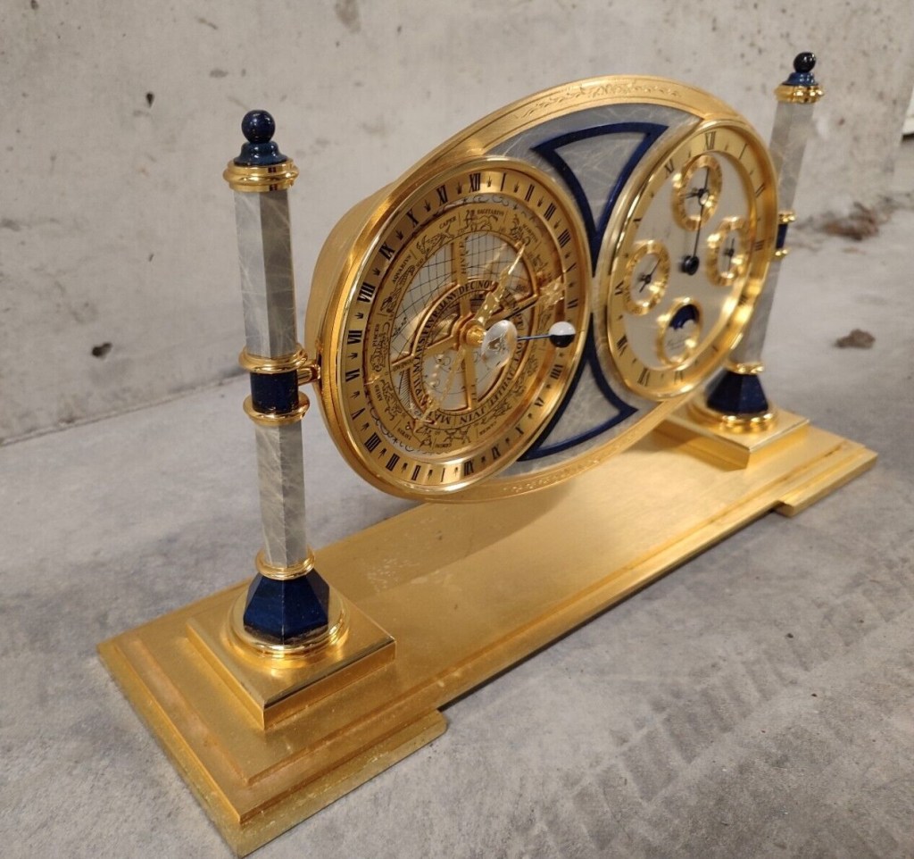 Horloge à poser sous cage de verre , astrolabe, sous forme de psyché , deux colonnes , marqueterie de nacre , référence 70 1616 A3WJ , dateur à date jour et mois , quantièmes de lune , heure sidérale et solaire , zodiaque , laiton plaqué or 24 carats , aiguilles Breguet noires , mouvement quartz à pile . Hauteur 26 cm , 10,4 inches . Voir les versions façon lapis – lazuli et faux marbre bordeaux .