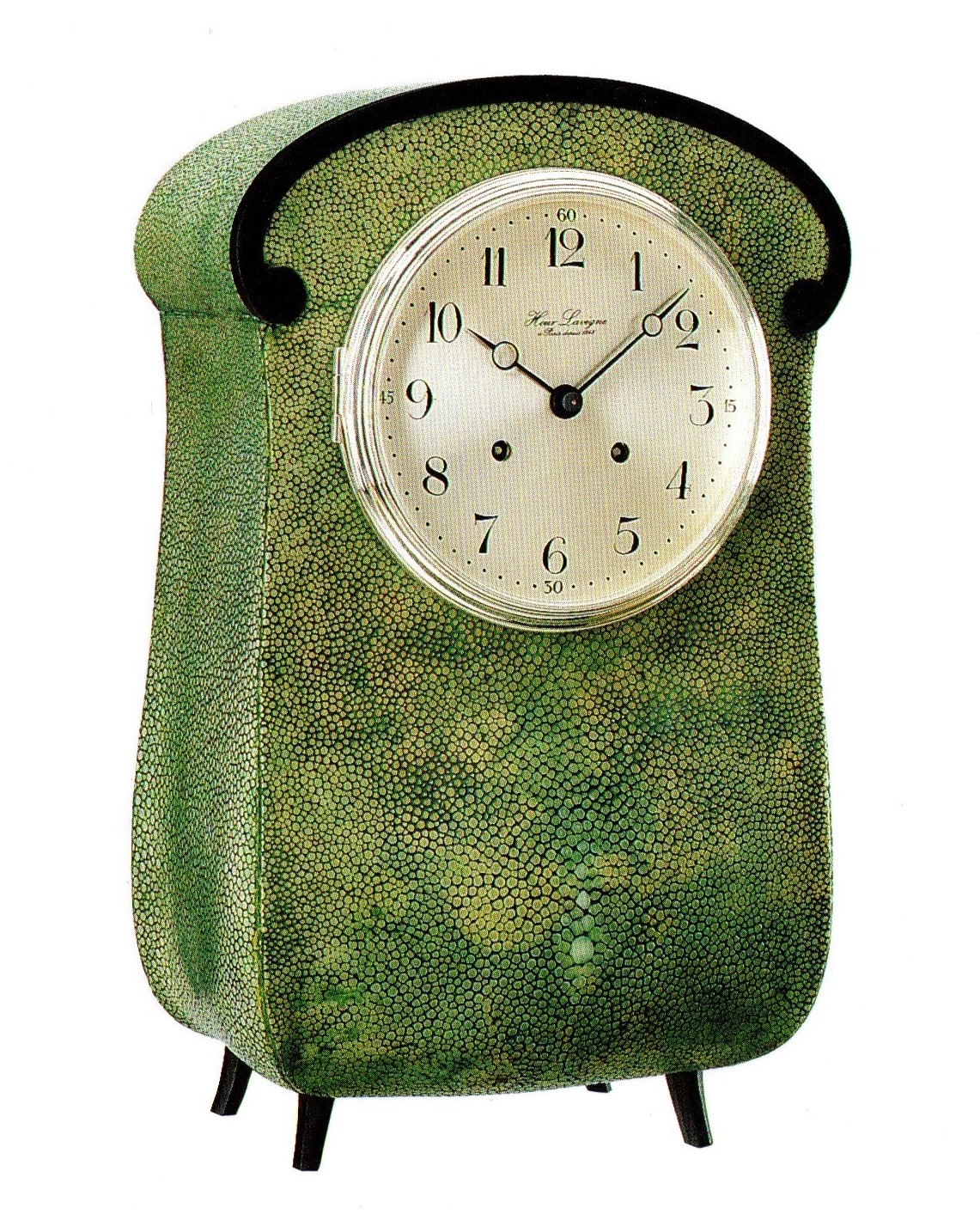 Cartel de style Art Déco , mouvement mécanique à clef amovible , 8 jours , remontage par l’avant grâce à la lunette plaquée argent ouvrante à droite , gainage de galuchat vert , référencé 70 1711 E3 YV , hauteur 29 cm soit 11,6 inches .