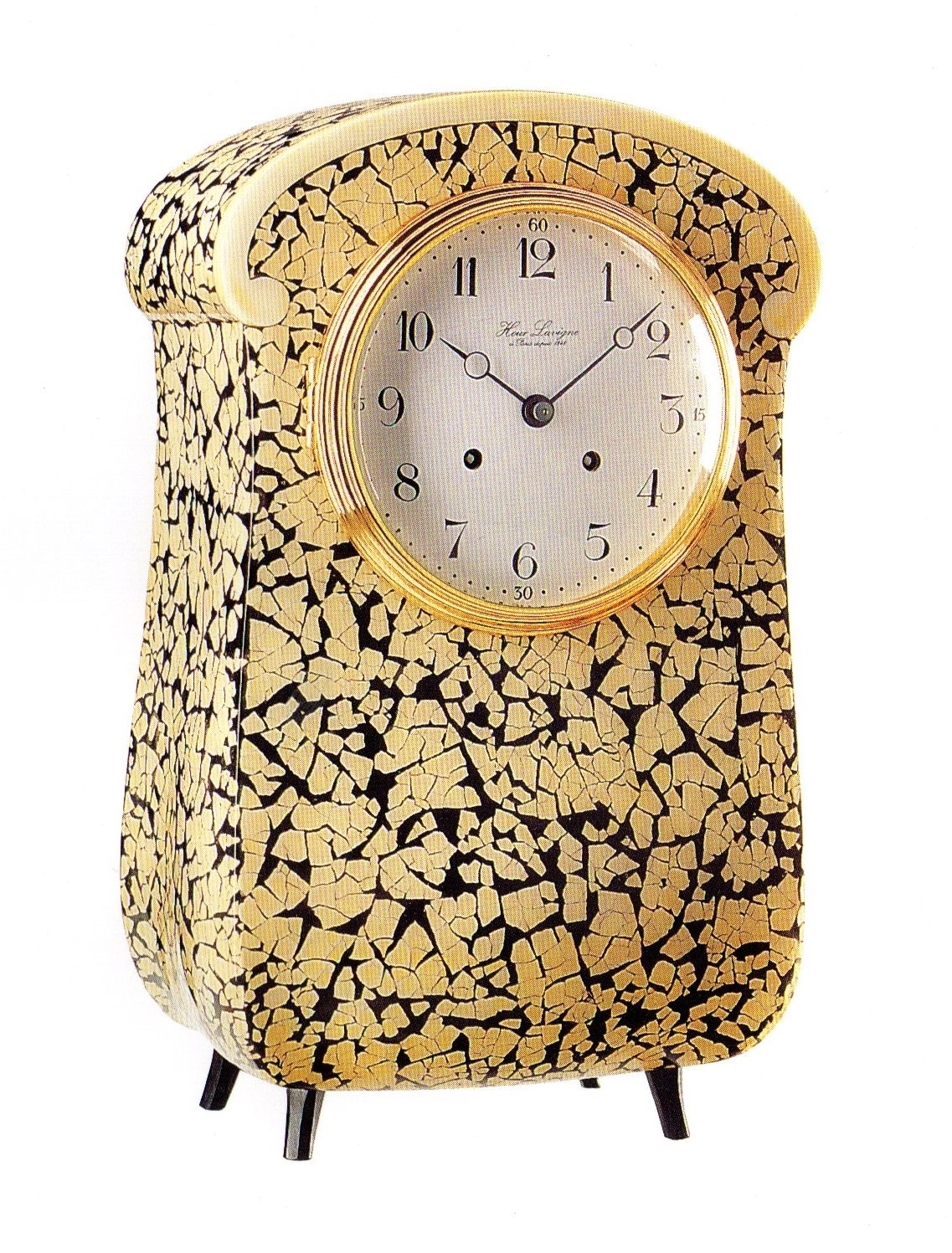 Cartel de style Art Déco , horloge à poser , mouvement mécanique à clef amovible , 8 jours, remontage par l’avant grâce à la lunette plaquée or 24 carats ouvrante à droite , plaquage de coquille d’œuf fond rouge , référencé 70 1711 E30N , hauteur 29 cm soit 11,6 inches .