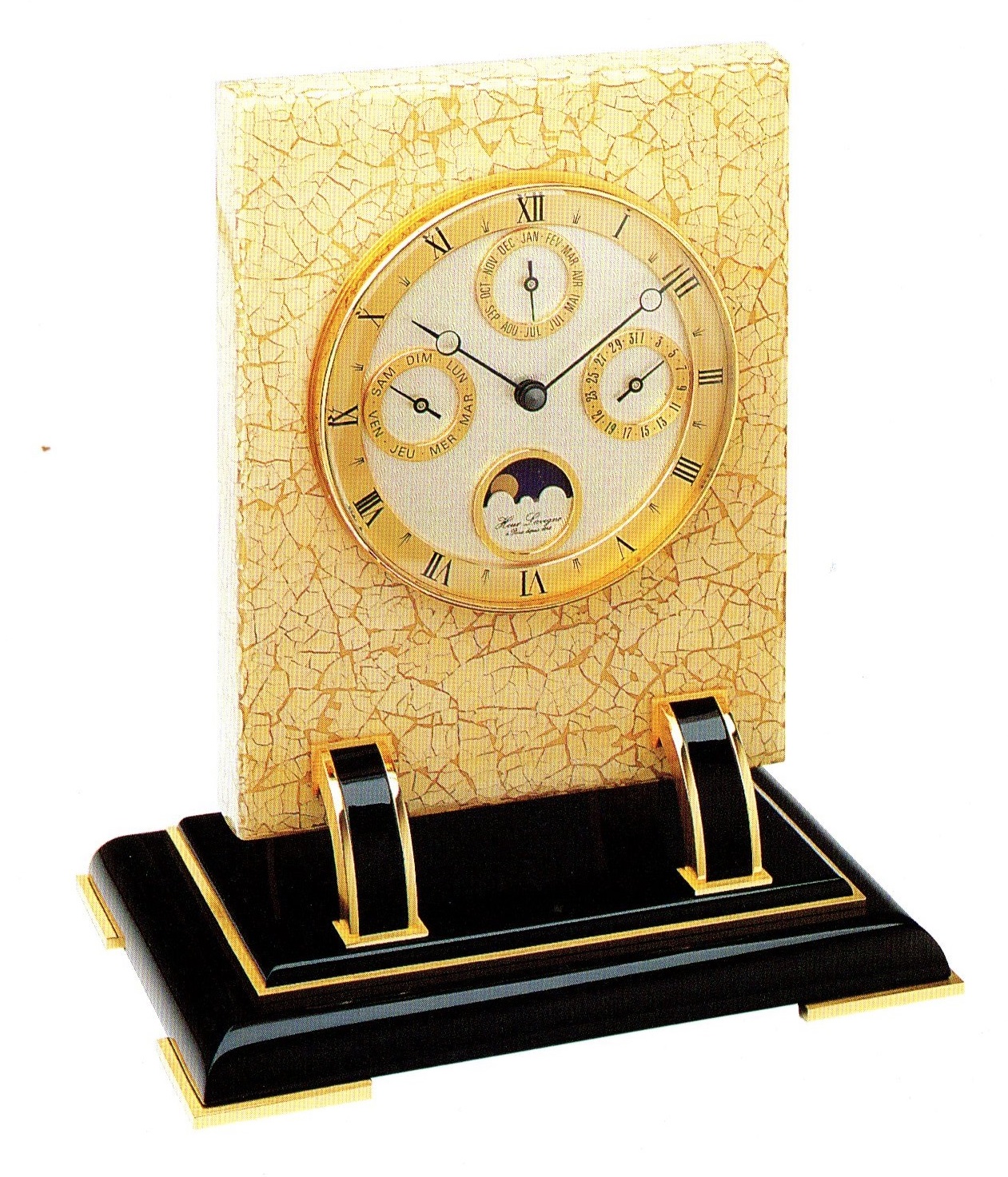 Panneau , horloge à poser , quantième de lunes , dateur à date jour et mois en trois cadrans , corps à décor de coquille d’œuf à fond miel , arceaux en laiton laqué noir et plaqué or 24 carats , chiffres romains sur disque doré , aiguilles noires Breguet , mouvement quartz à pile , référence 70 1686 A 30M , hauteur 27 cm , 10,8 inches .