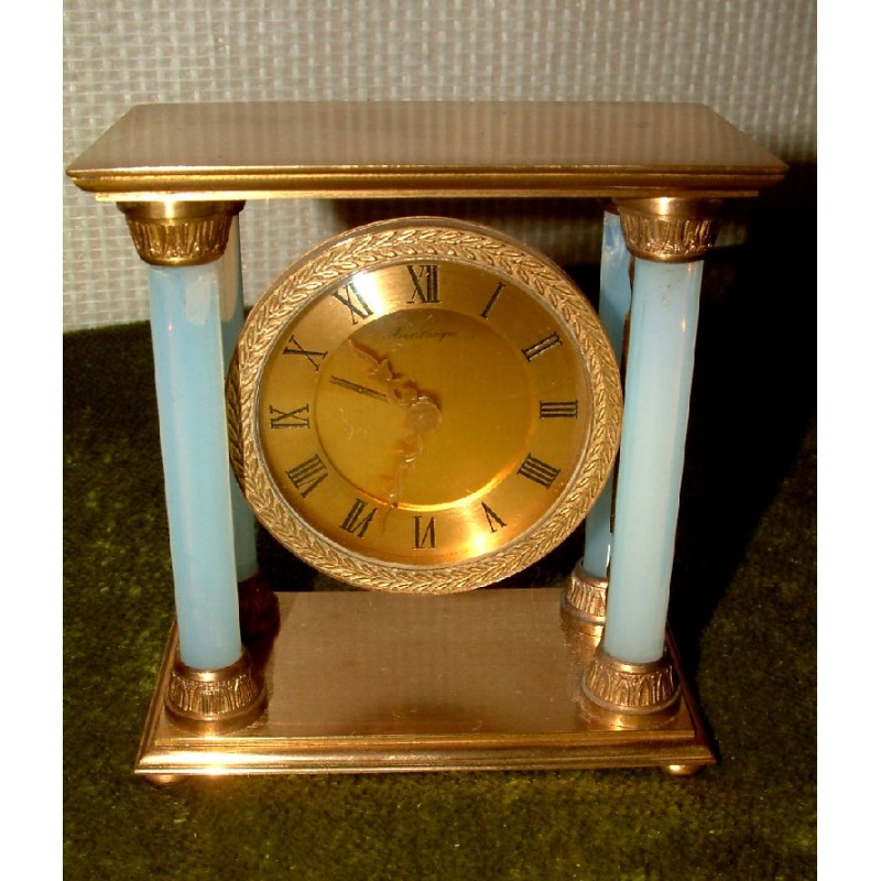 Petite horloge à poser , portique , à quatre colonnes en Altuglas , mouvement mécanique , mono-barillet à clef unique , chiffres romains sur disque doré Hauteur: 10 cm Largeur: 10 cm Profondeur: 5 cm. La version ci-dessous a été affublée d’un faux centre de cadran destiné probablement à cacher un défaut