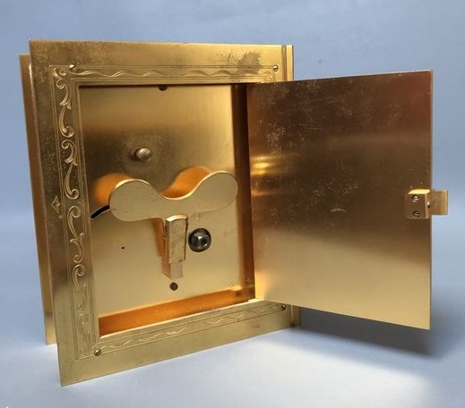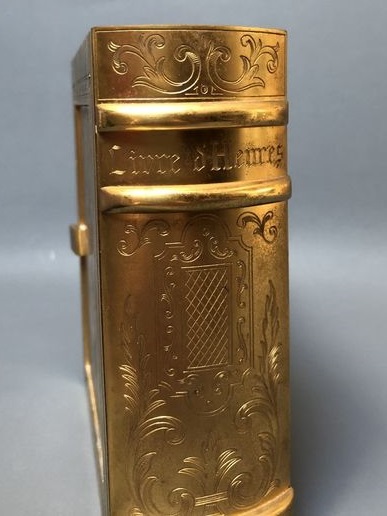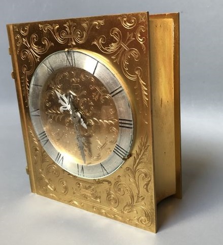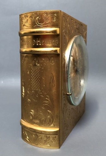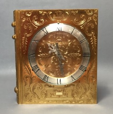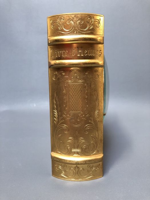 JUST ou HOUR LAVIGNE , pendule à poser , en forme livre d’heures, mouvement mécanique , autonomie 30 jours , à clef amovible , chiffres romains sur disque argenté . Hauteur : 16,5 cm Largeur : 14 cm par 5,5 cm d’épaisseur. Poids : 3.5 Kg
