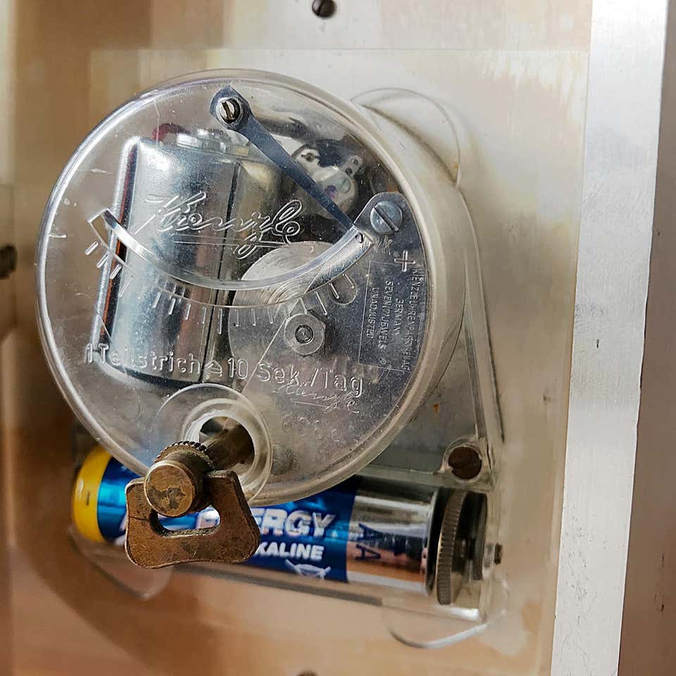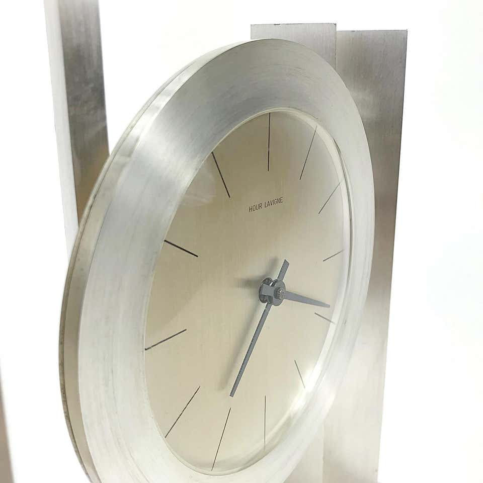 Hour Lavigne, horloge de table. Corps en laiton plaqué argent ,portique sur quatre colonnes rectangulaires , avec vitre bombée en plexiglas , pas de chiffres mais des index , aiguilles noires , mouvement électrique par Kienzle , 7 rubis , pile LR6 . Mesures: H 22 cm / 8,6 pouces L 22 cm / 8,6 pouces D 6 cm / 2,3 pouces