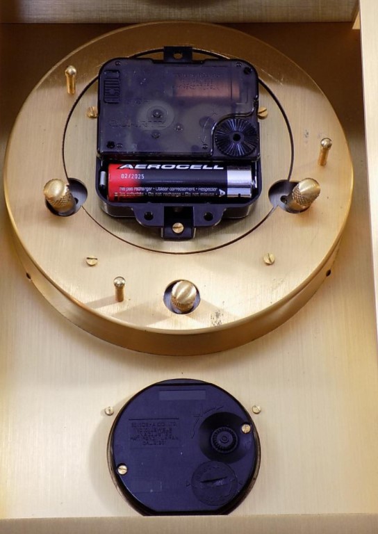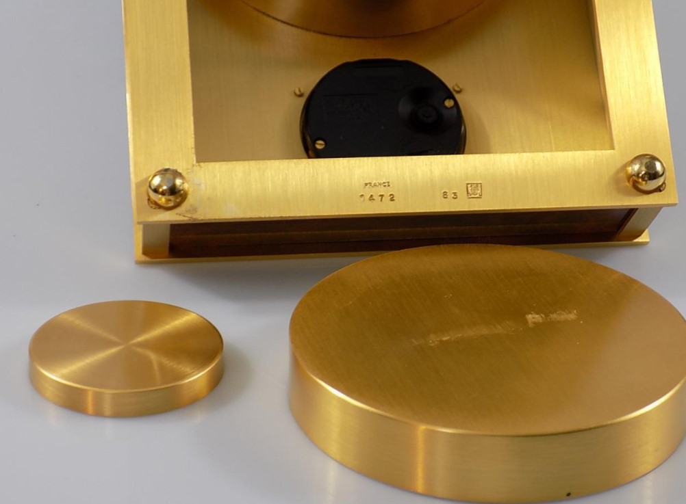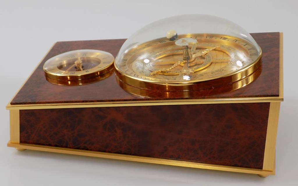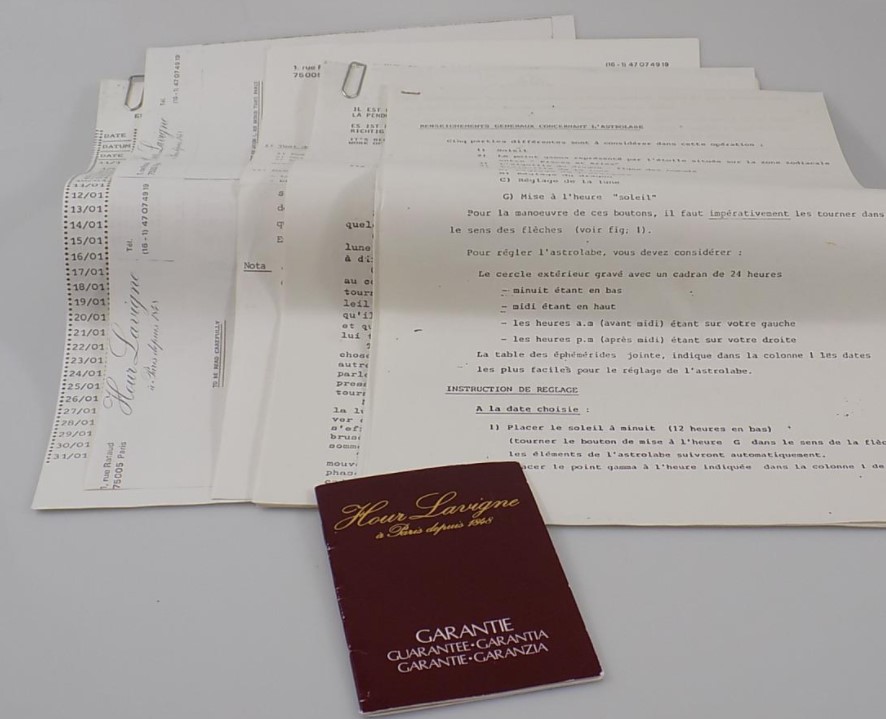 Hour Lavigne , Astrolabe et horloge , à quartz , à pile LR6 , hauteur 7,5 cm largeur 15,5 cm longueur 21,5 cm , référence 70 1472 A3E . Horloge à pile bouton , mention France en bas de cadran , chiffres romains sur disque doré .
