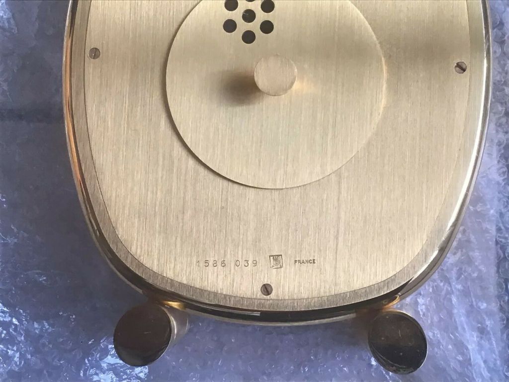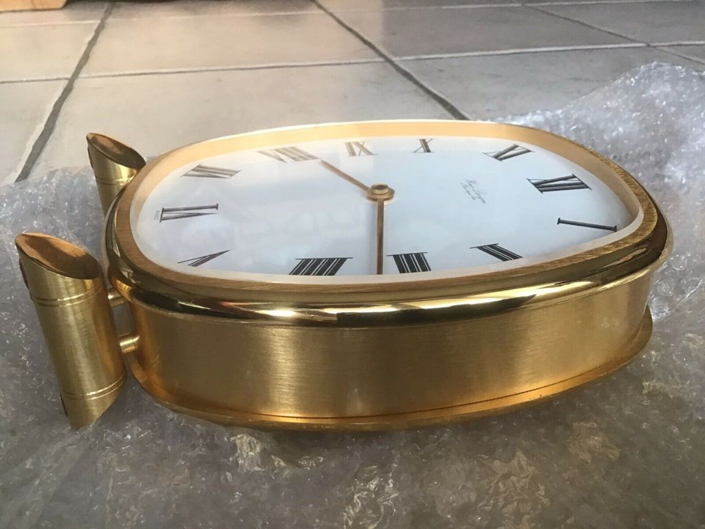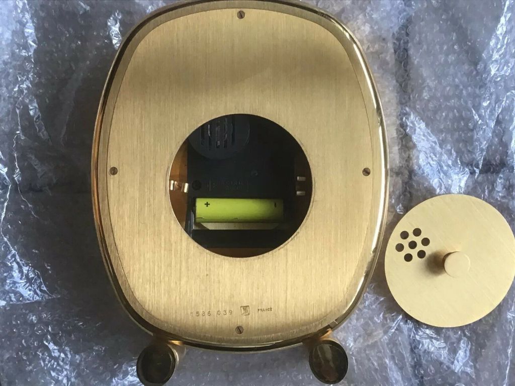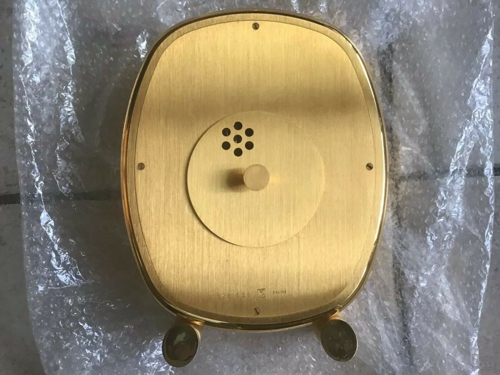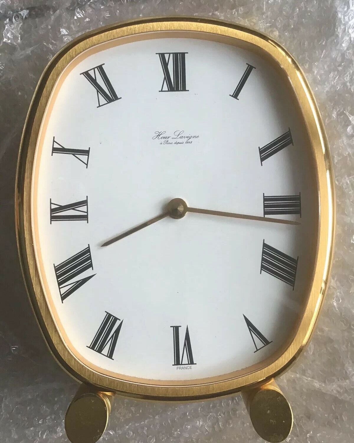 HOUR LAVIGNE , grande horloge à poser , corps en laiton doré , chiffres romains sur cadran blanc , mention France en bas de cadran , format 21 x 16 cm . Mouvement à quartz , à sonnerie des heures et demies , à pile LR6