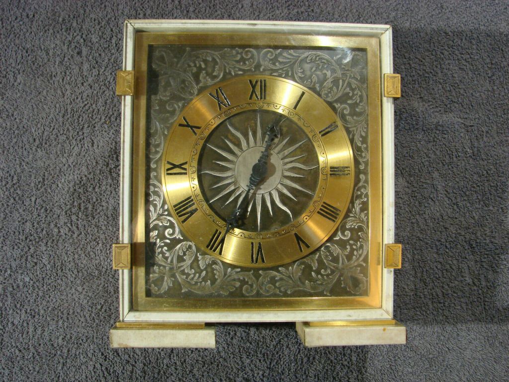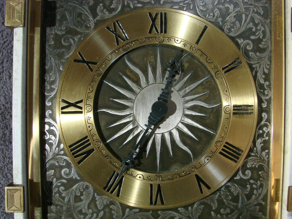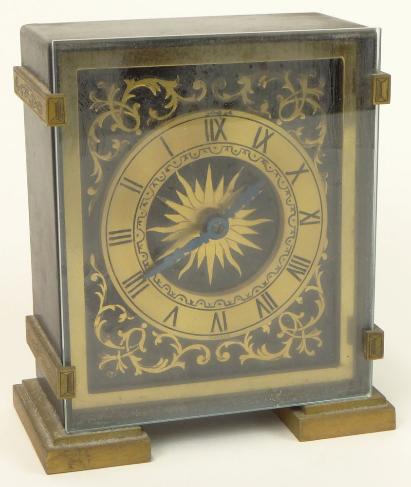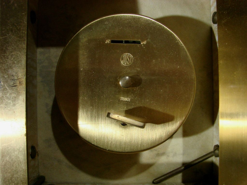 Just , pendulette de bureau , mouvement mécanique estampillé Just , chiffres romains noirs sur disque doré , centre du cadran à décor de soleil derrière une vitre , décor végétal de feuilles d’acanthes stylisées, corps en laiton doré gainé de parchemin, aiguilles noires , vitre en verre plat . aiguilles noires non lumineuses, mesure 10,48 cm de hauteur et 9,2 cm de largeur