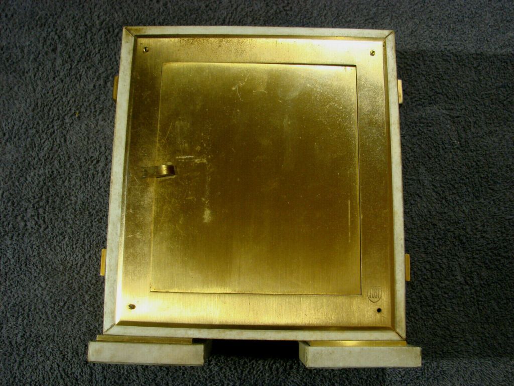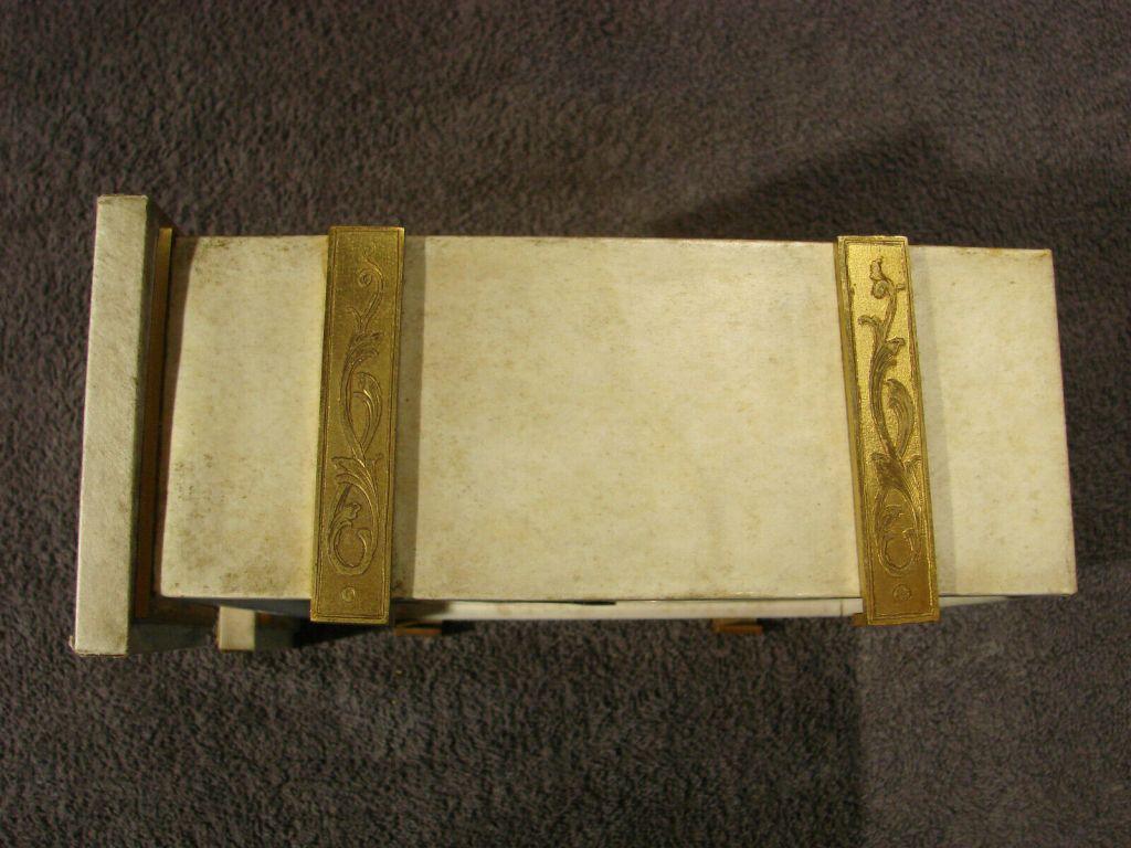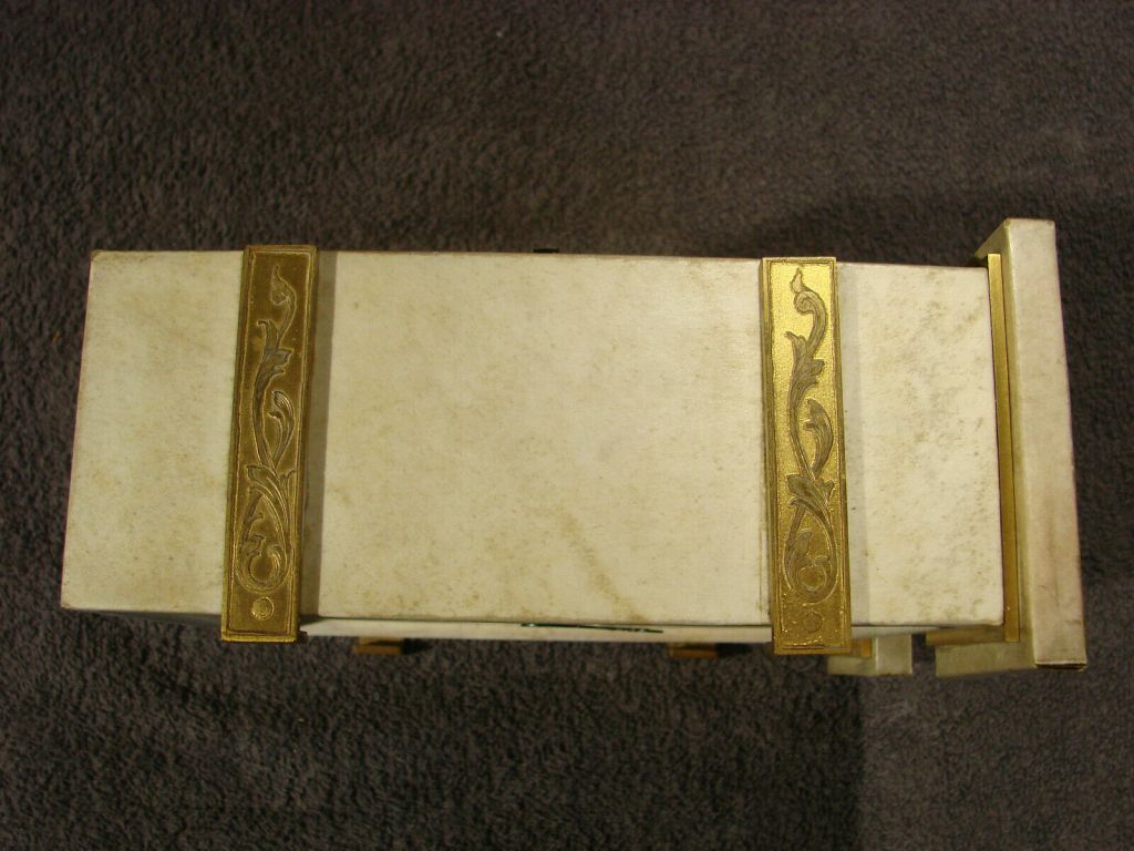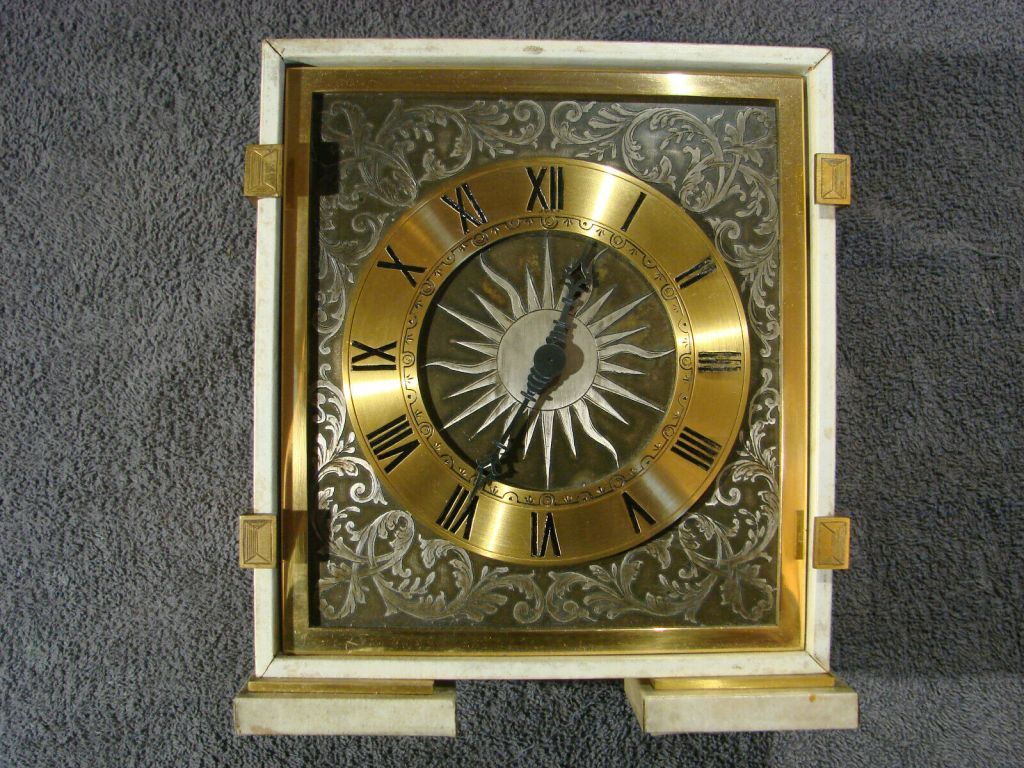 Just , pendulette de bureau , mouvement mécanique estampillé Just , chiffres romains noirs sur disque doré , centre du cadran à décor de soleil derrière une vitre , décor végétal de feuilles d’acanthes stylisées, corps en laiton doré gainé de parchemin, aiguilles noires , vitre en verre plat . aiguilles noires non lumineuses, mesure 10,48 cm de hauteur et 9,2 cm de largeur