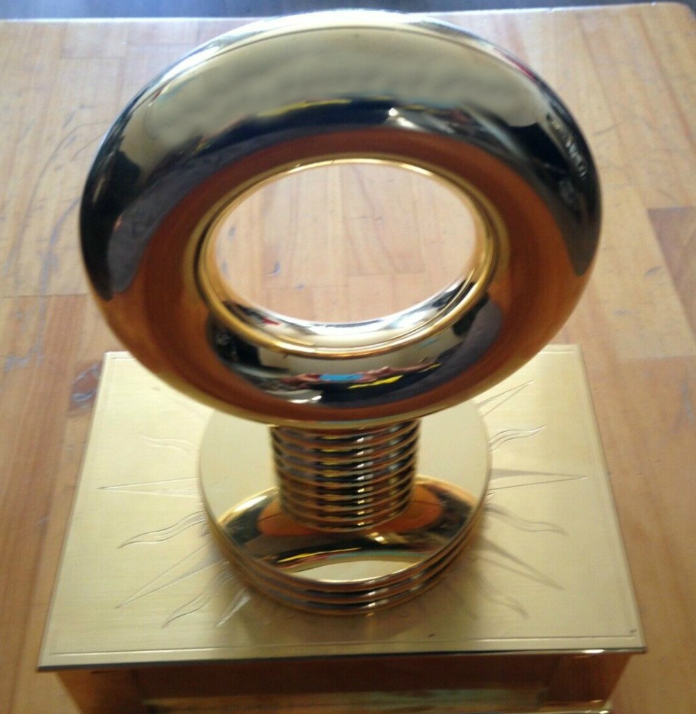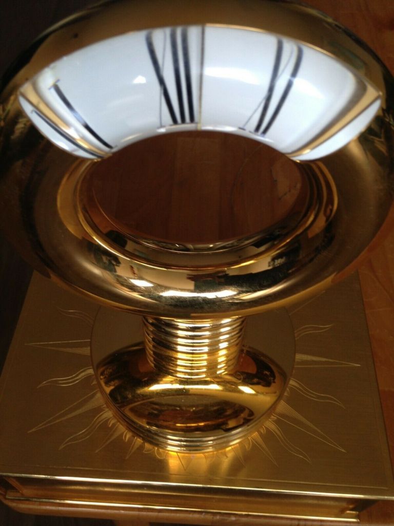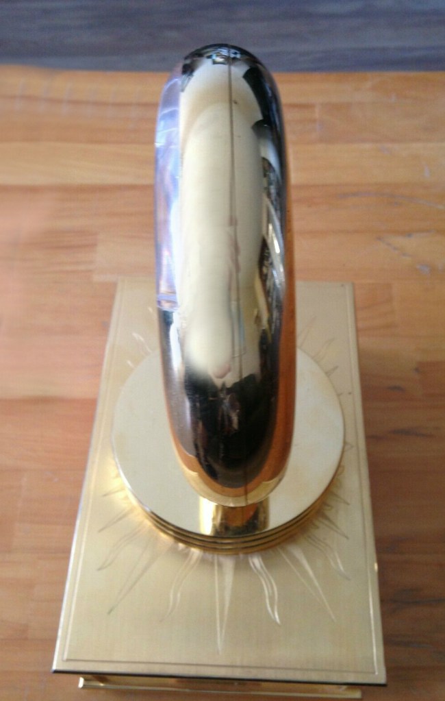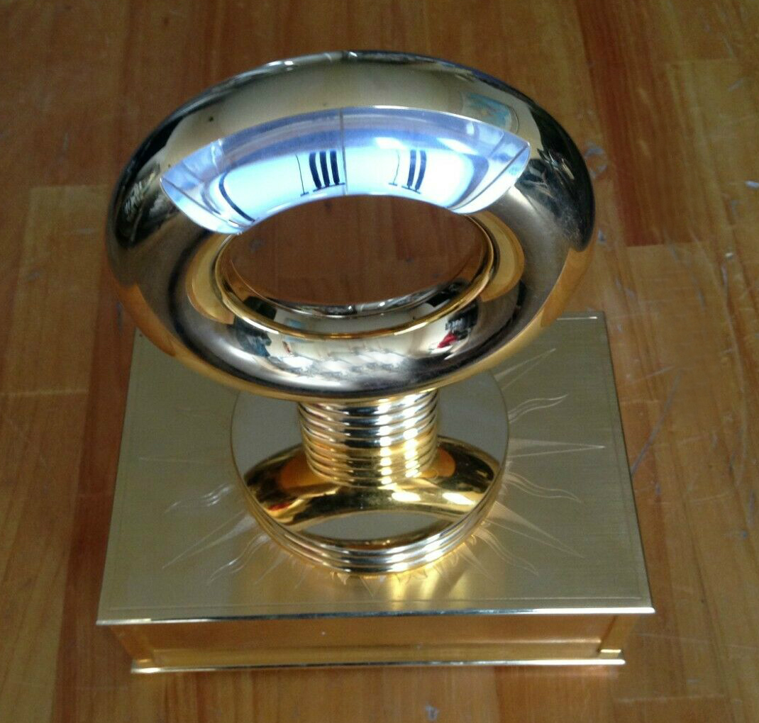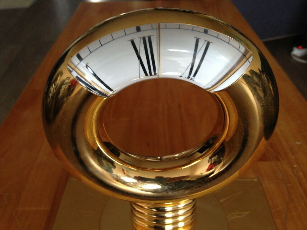 Hour Lavigne , anneau sur socle , horloge à poser , corps doré , chiffres romains , mouvement Quartz made in Japan , à pile LR6, corps fabriqué en France , hauteur 22 cm pour l’horloge . mouvement à quartz , laiton dorée à l’or fin 24 carat , format hauteur 28 x longueur 20 x largeur 13 cm . Poids 5,1 Kg. Voir les versions sans boîte .