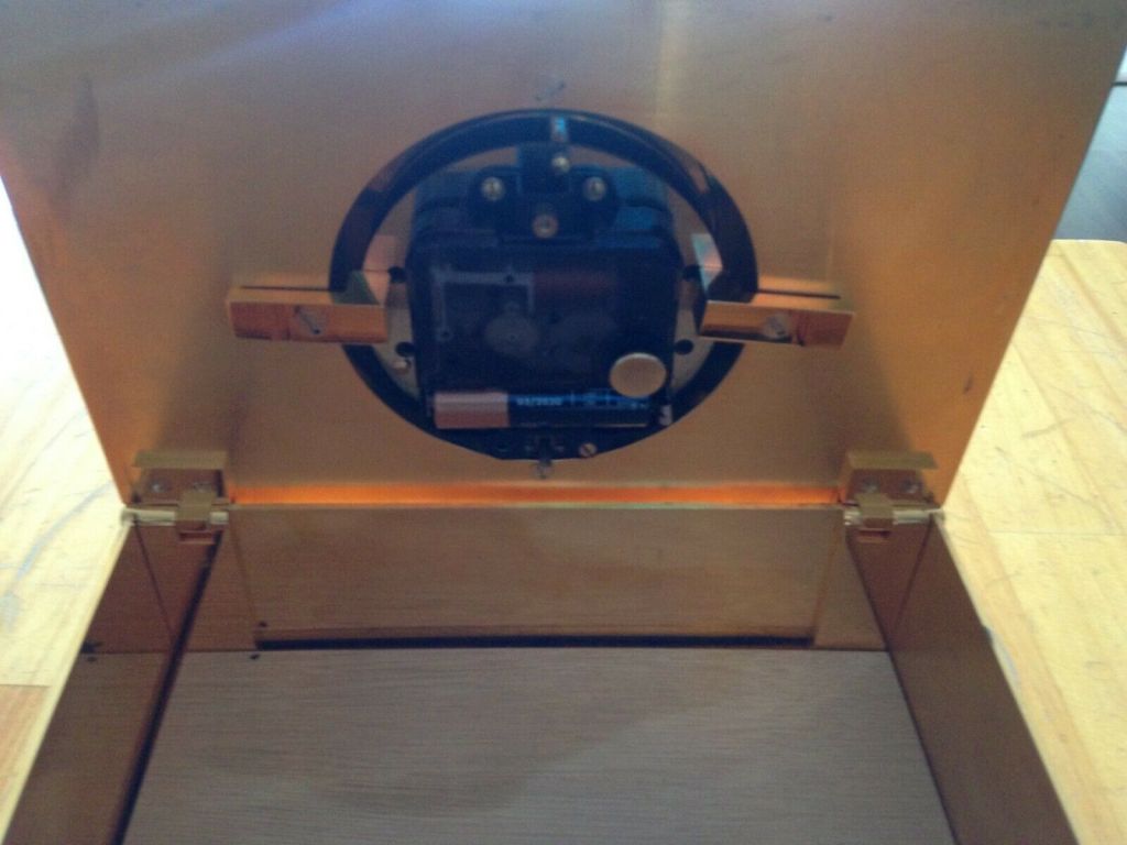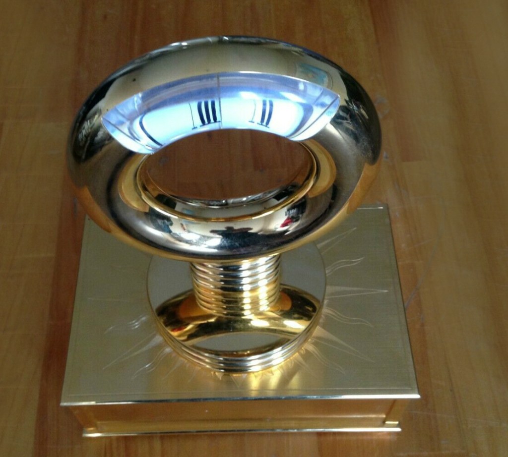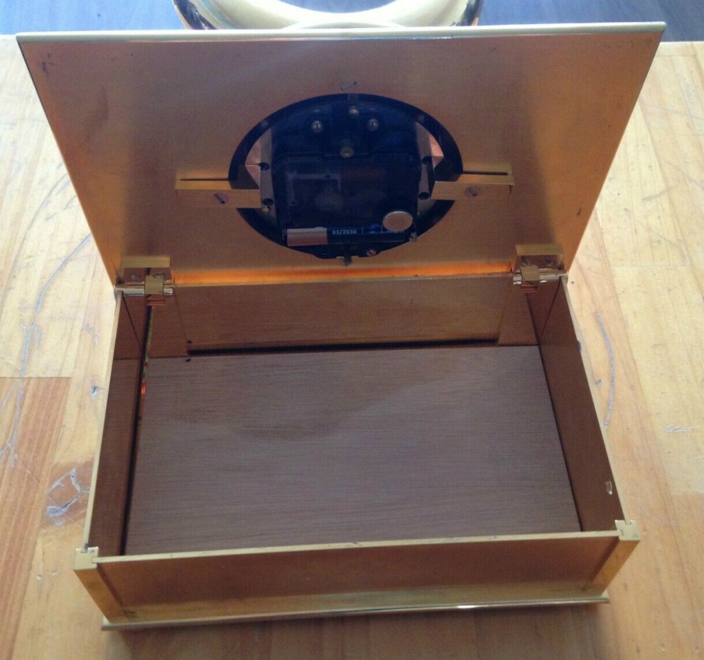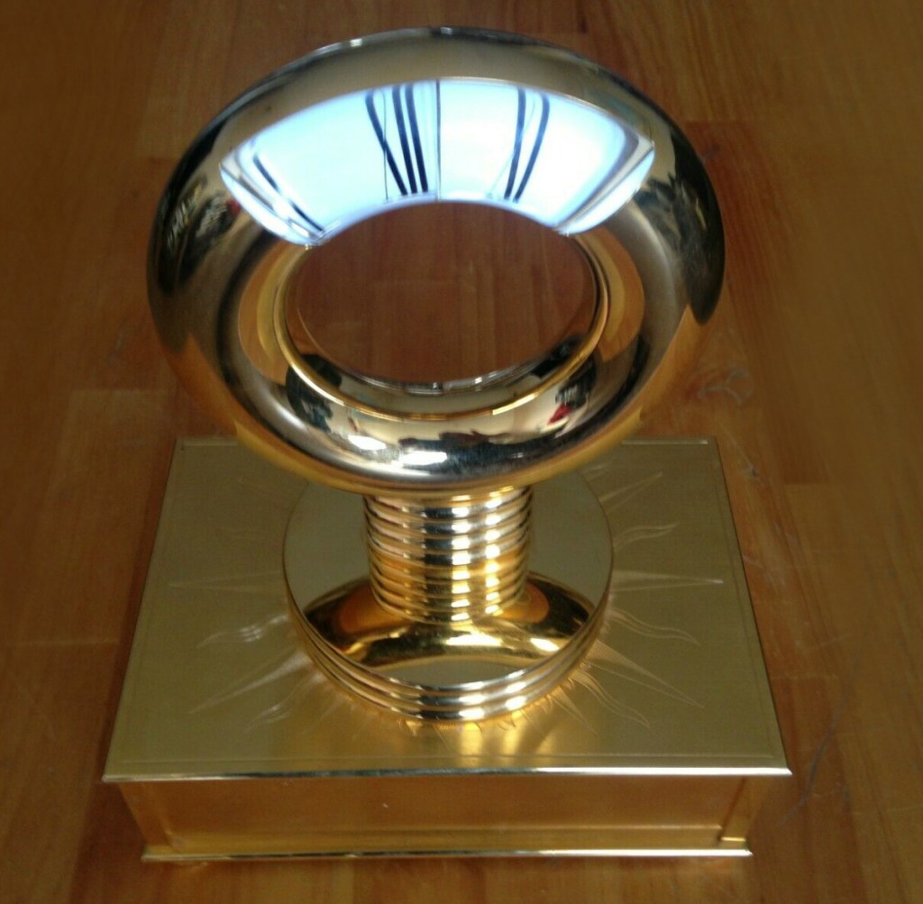 Hour Lavigne , anneau sur socle , horloge à poser , corps doré , chiffres romains , mouvement Quartz made in Japan , à pile LR6, corps fabriqué en France , hauteur 22 cm pour l’horloge . mouvement à quartz , laiton dorée à l’or fin 24 carat , format hauteur 28 x longueur 20 x largeur 13 cm . Poids 5,1 Kg. Voir les versions sans boîte .