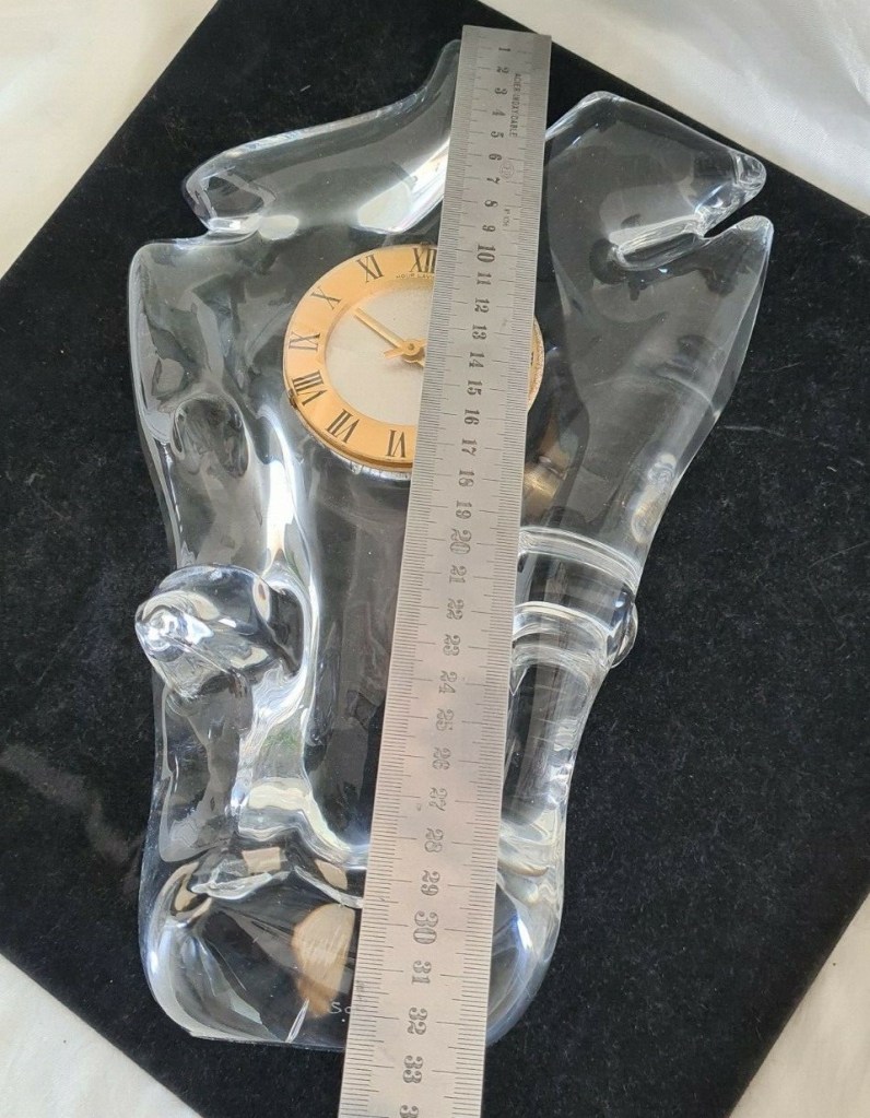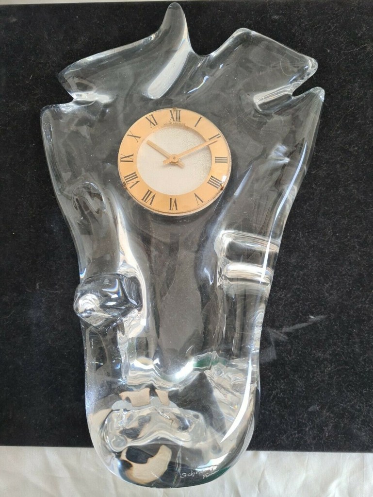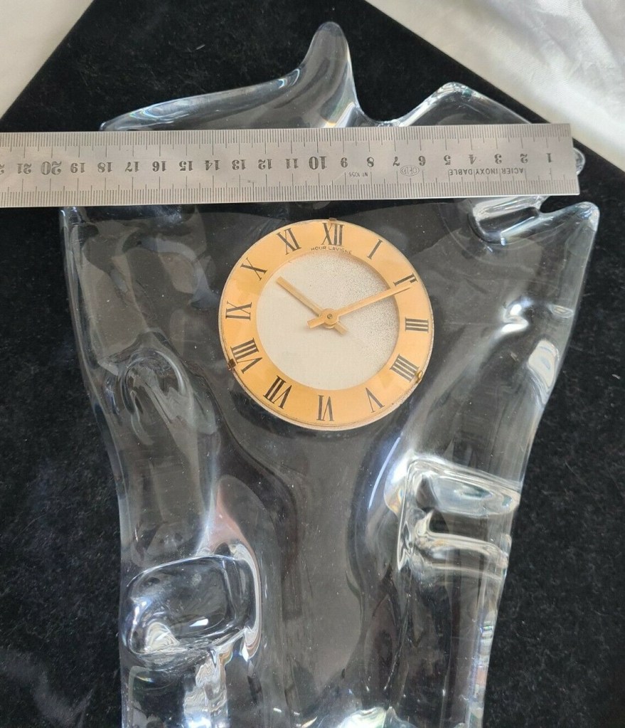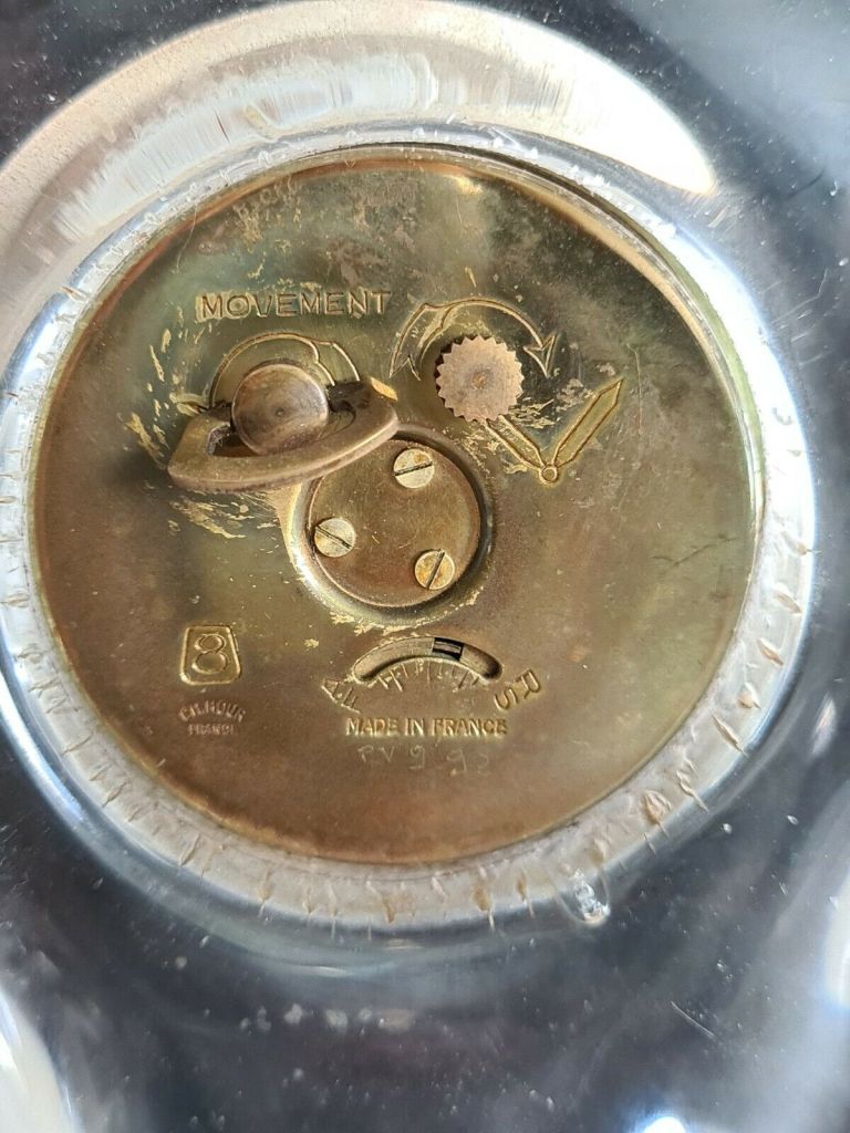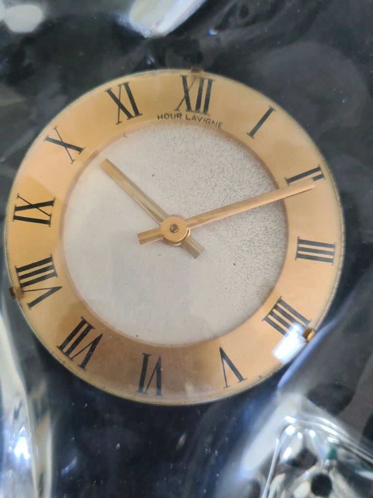 Horloge à poser sans fonction réveil , corps en cristal Schneider , aiguilles dorées , cadran blanc , chiffres romains sur disque doré , mouvement mécanique , 8 jours , Diamètre du cadran 7,5 cm. Boitier en cristal 32 x 20 cm