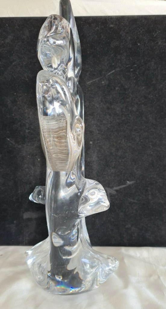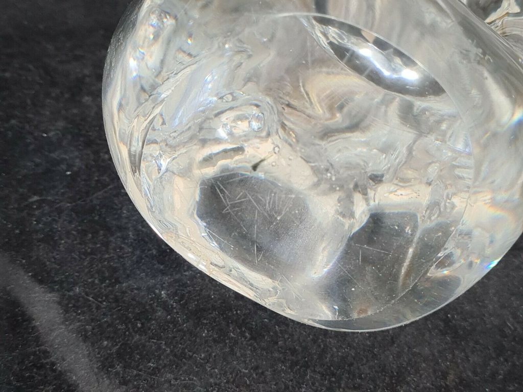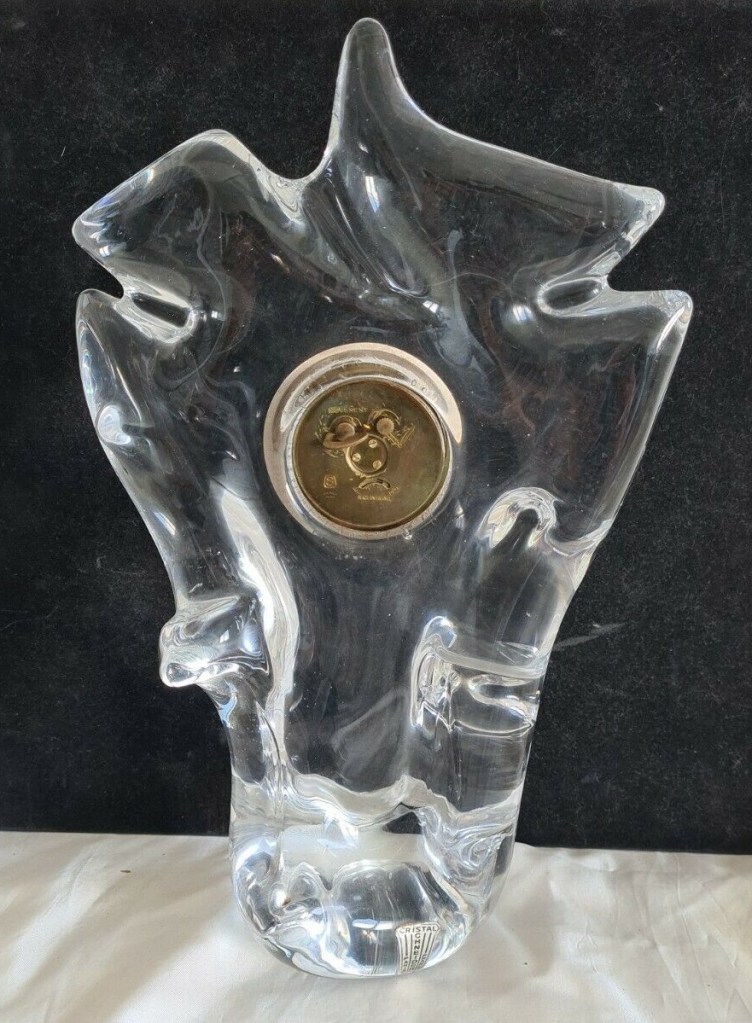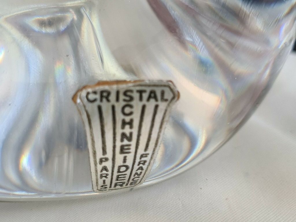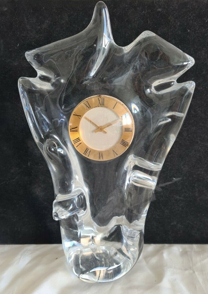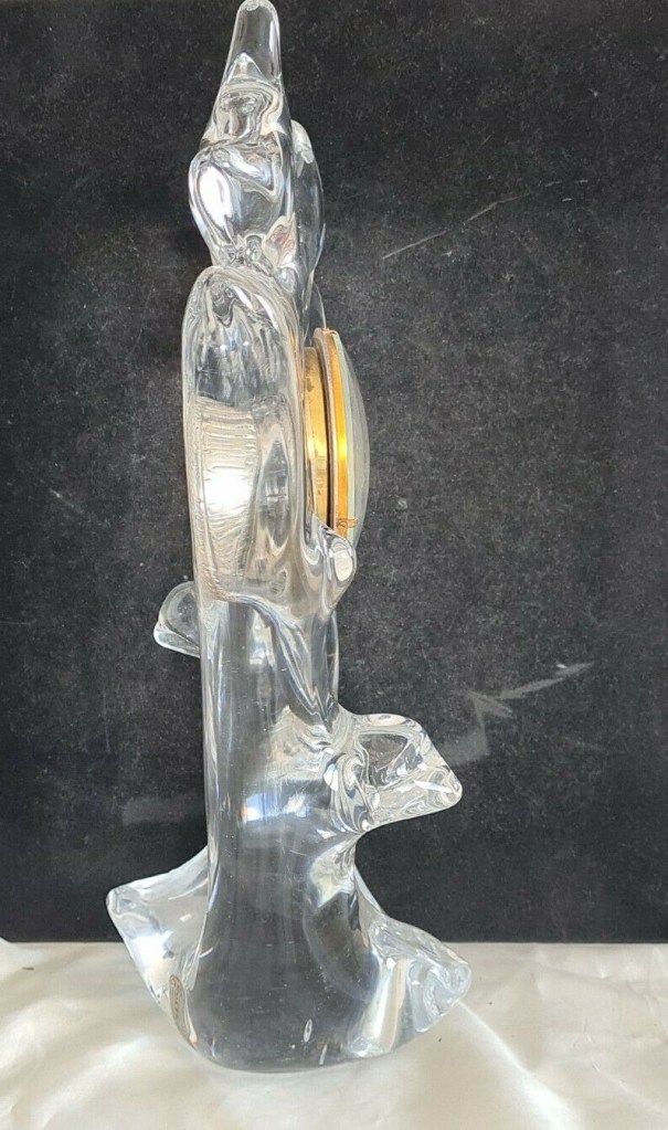 Horloge à poser sans fonction réveil , corps en cristal Schneider , aiguilles dorées , cadran blanc , chiffres romains sur disque doré , mouvement mécanique , 8 jours , Diamètre du cadran 7,5 cm. Boitier en cristal 32 x 20 cm