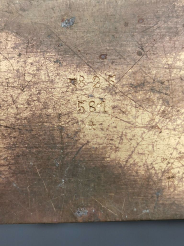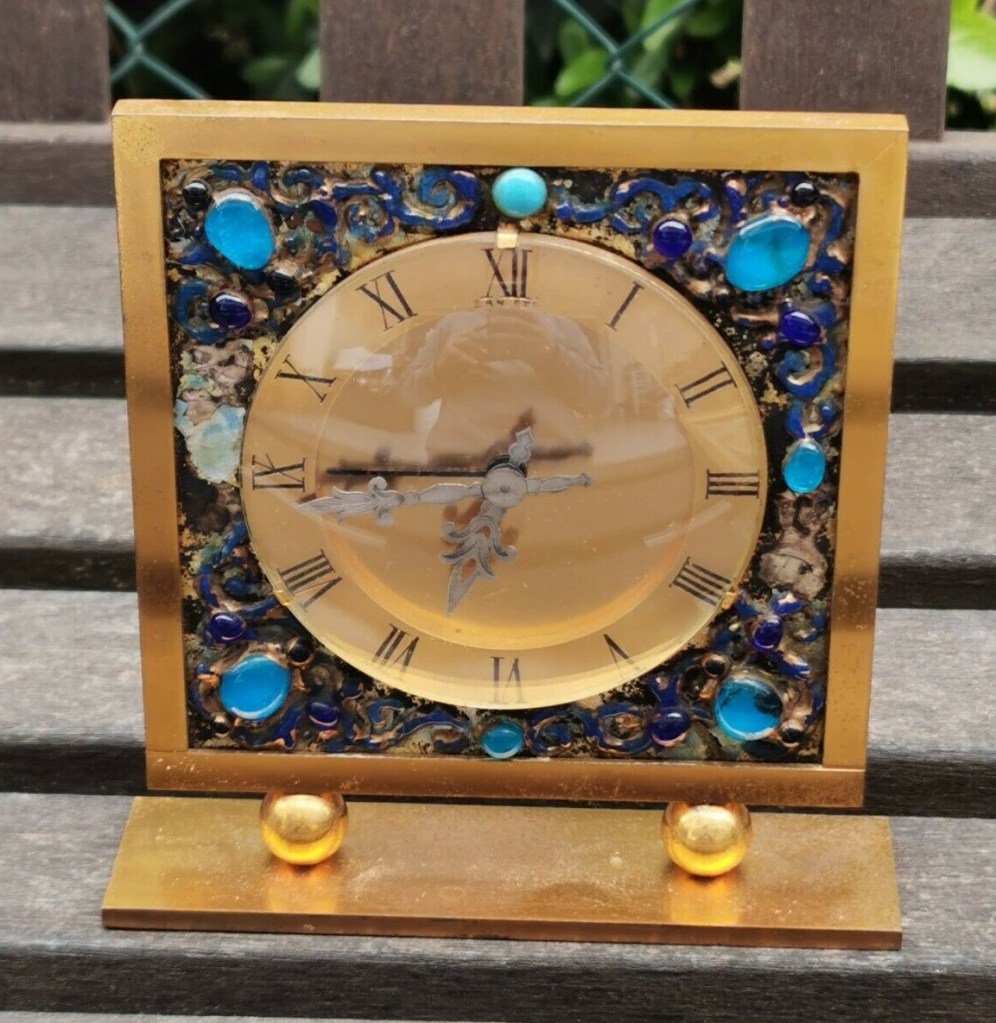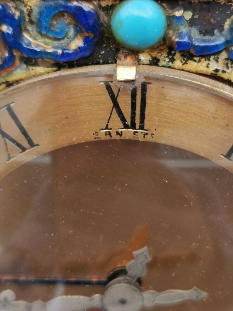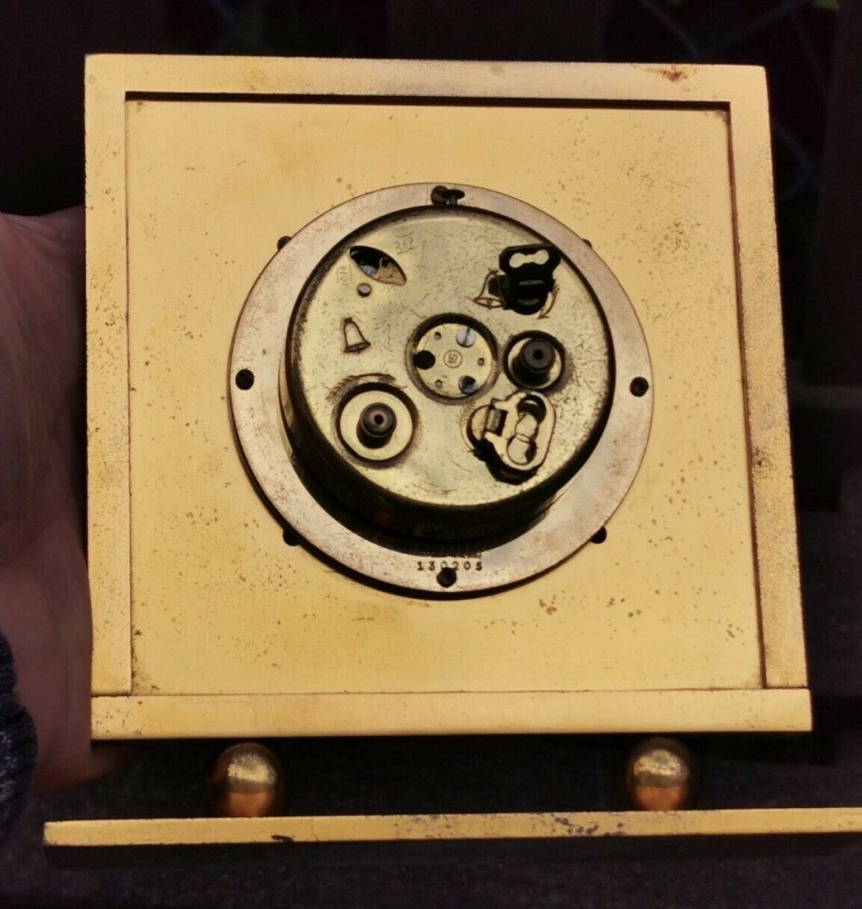 Hour Lavigne , réveil carré sur terrasse dorée et deux boules en guise d’intersocle , mouvement mécanique , aiguilles fleur de lys en acier , chiffres romains sur disque doré , Hauteur : 13,1 cm Longueur à la base : 12,8 cm Largeur à la base : 3,4 cm