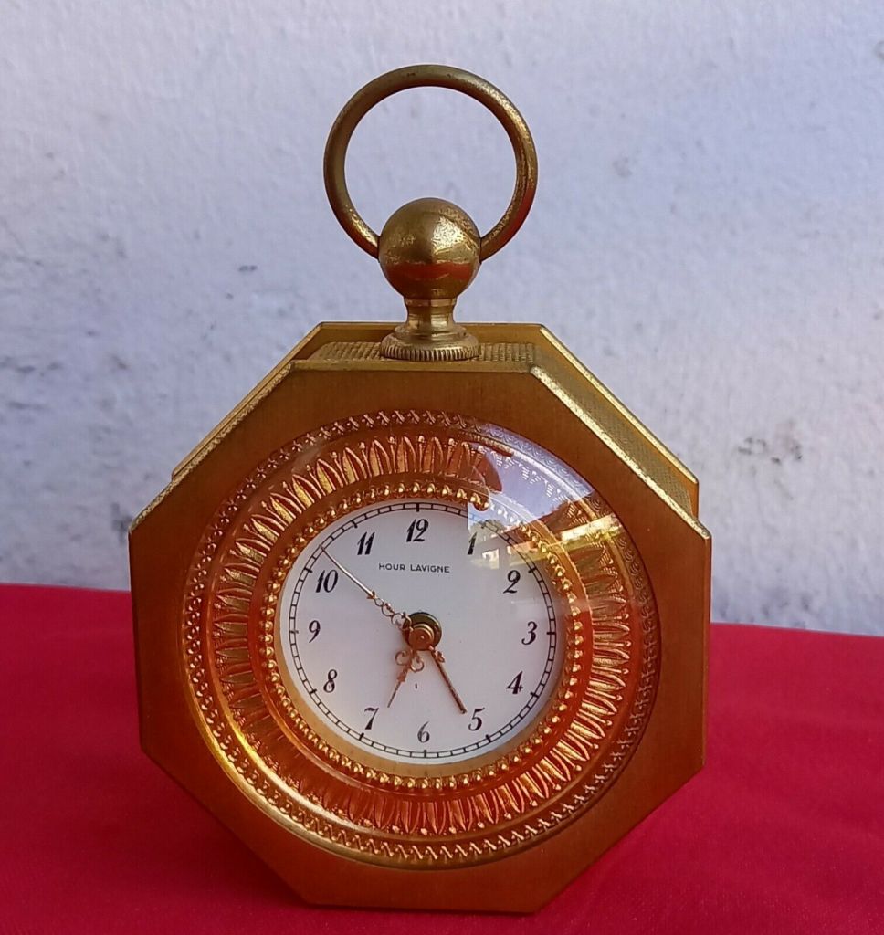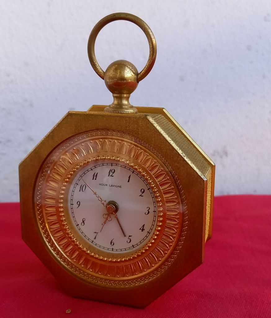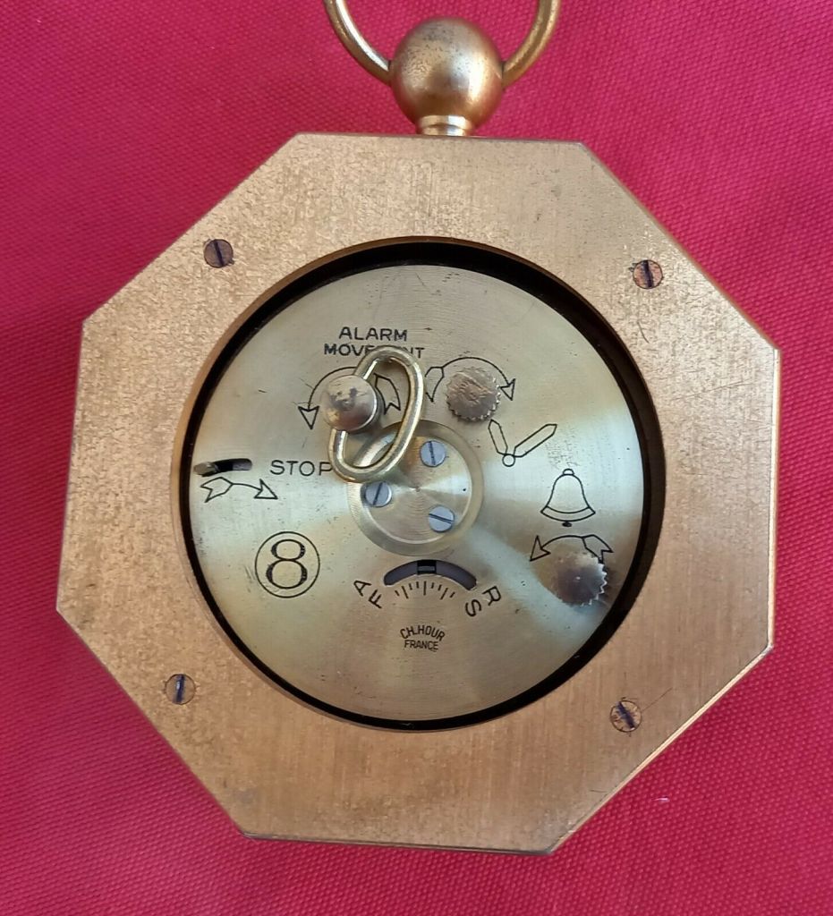 Réveil à suspendre ou poser , de forme octogonale , avec bélière, de style Louis XVI , laiton doré , aiguilles dorées , chemin de fer rond au pourtour du cadran émaillé , chiffres Breguet , mouvement mécanique , 8 jours , poids 418 grammes diamètre sans la boule du haut 8,5 cm
