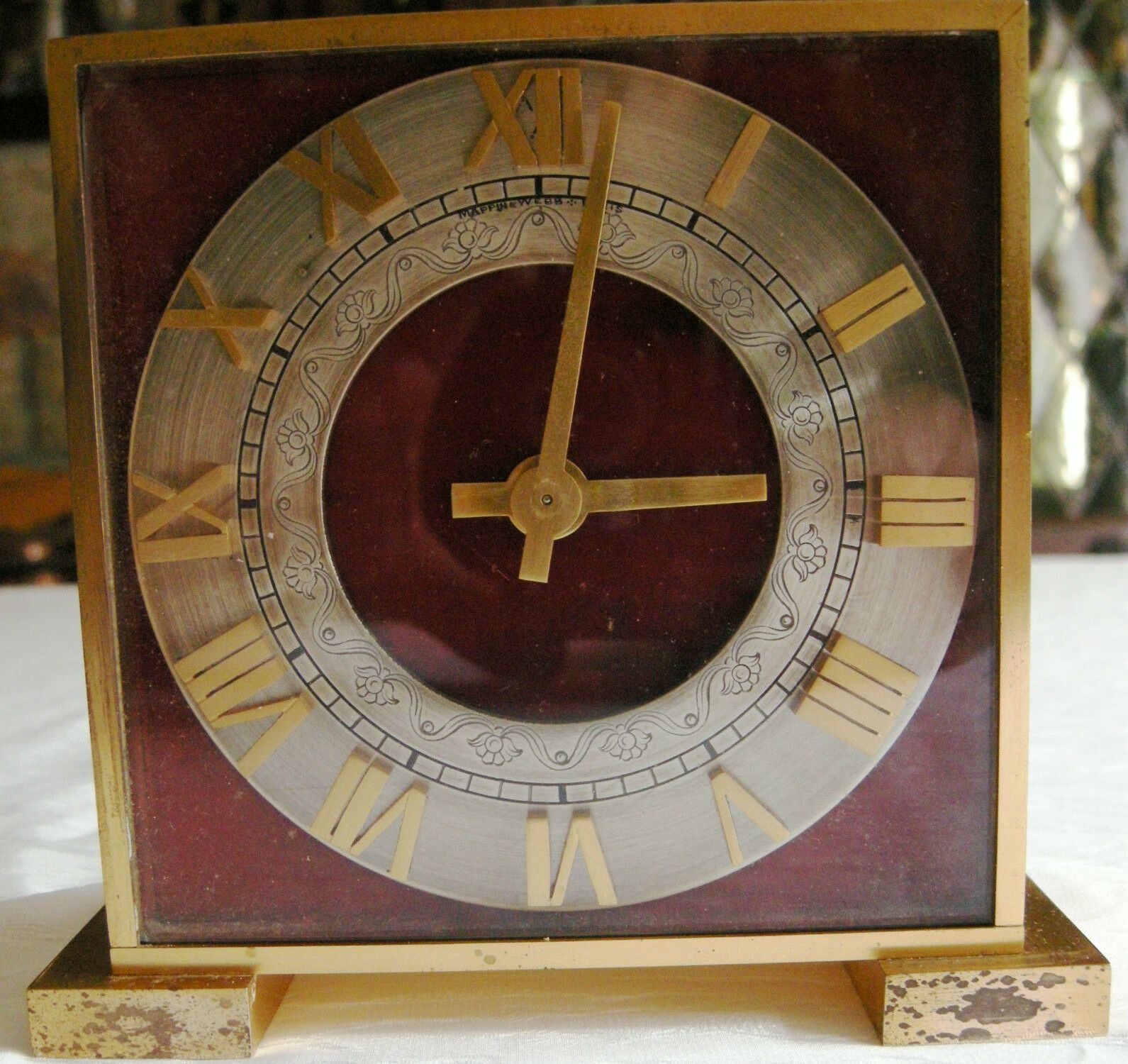 Pendulette MAPPIN & WEEB par JUST ; Forme carrée, cadran avec chiffres romains reliefs sur disque argenté décorée d’une frise de fleurs gravée en creux , aiguilles dorées , non-lumineuse , mouvement mécanique par Just . Dimensions: à la base: 14,2 cm X 4,5 cm, hauteur: 13 cm, profondeur pendulette seule: 3,5 cm . Poids: 1,450 kg