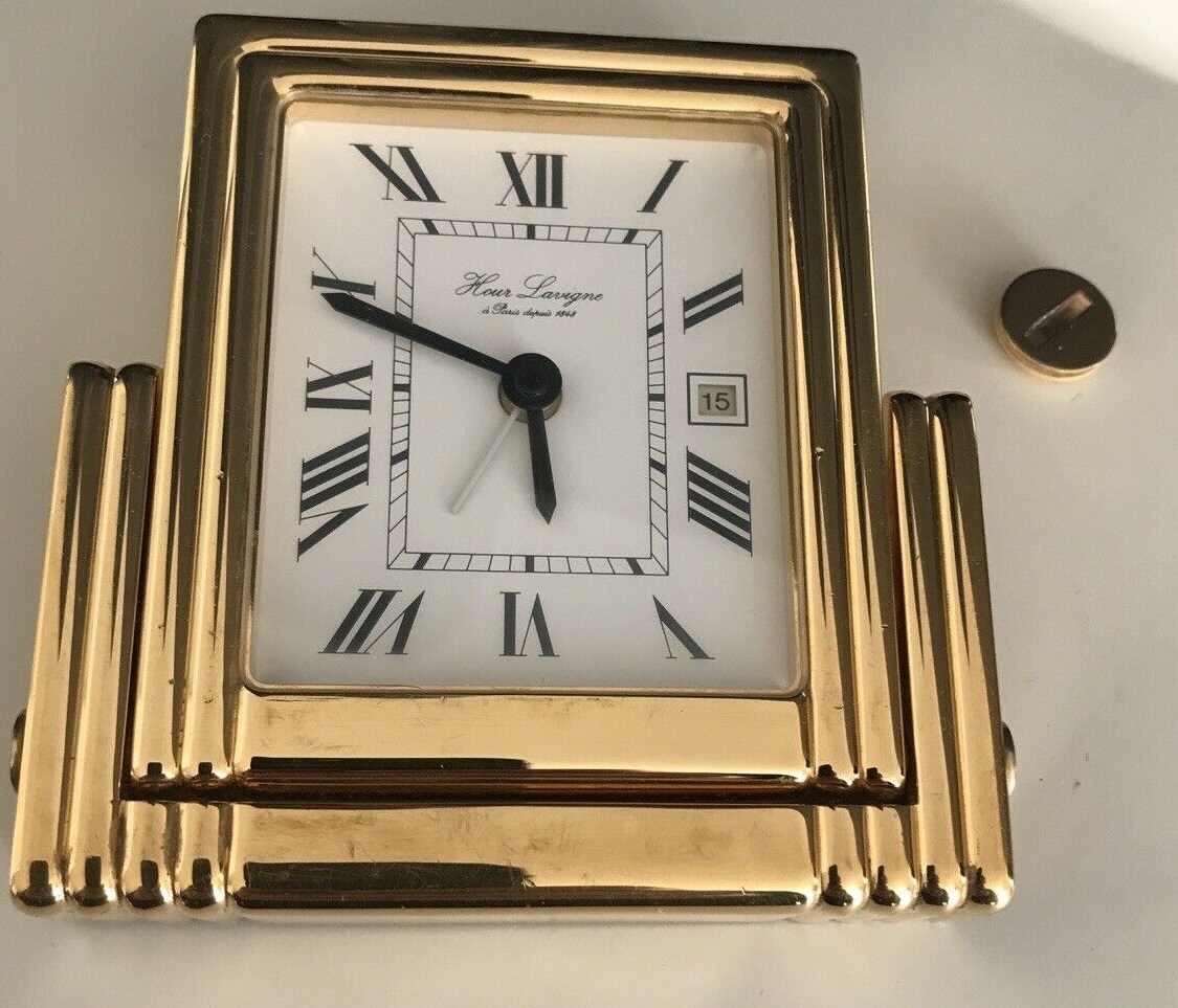 Hour Lavigne , réveil à godrons dorés , quartz à pile bouton , aiguilles glaives noires , aiguille du réveil blanche , chiffres romains , chemin de fer à l’intérieur de la zone des heures , Largeur de la base 7cm , largeur du corps 5,18 cm et profondeur 7 mm . existe en version Lancel