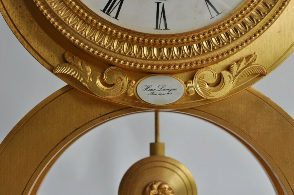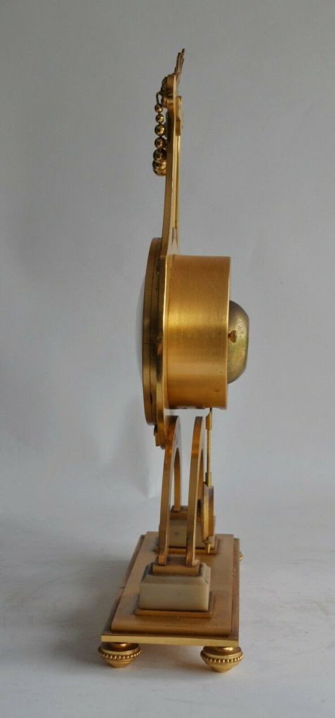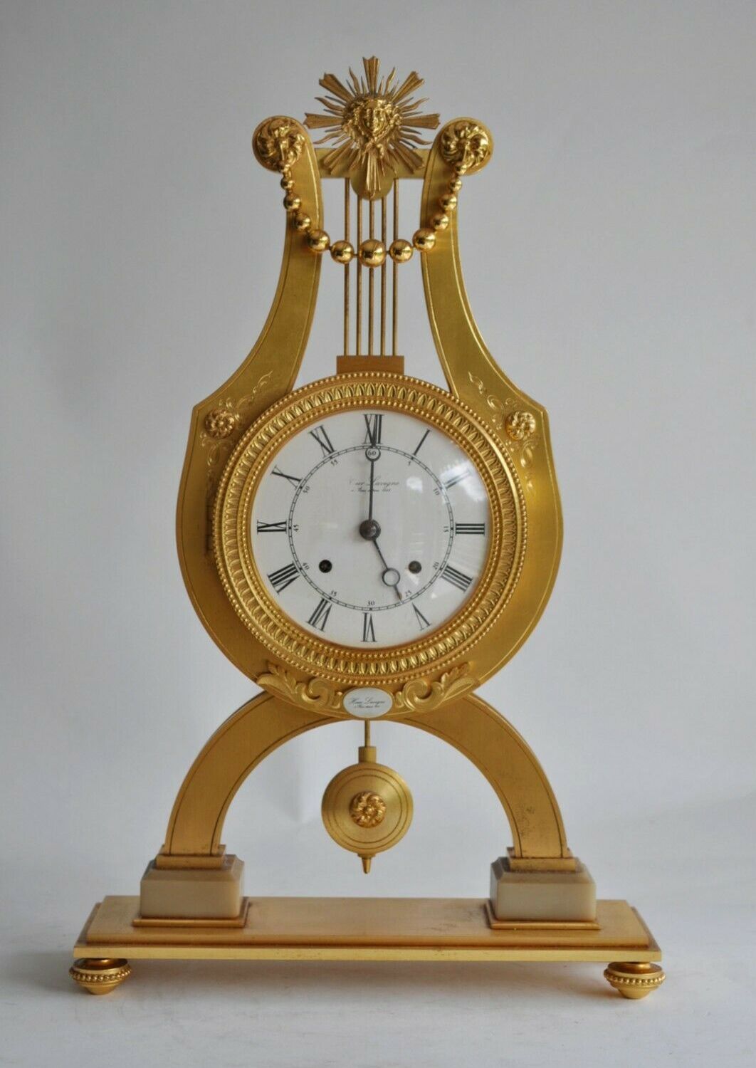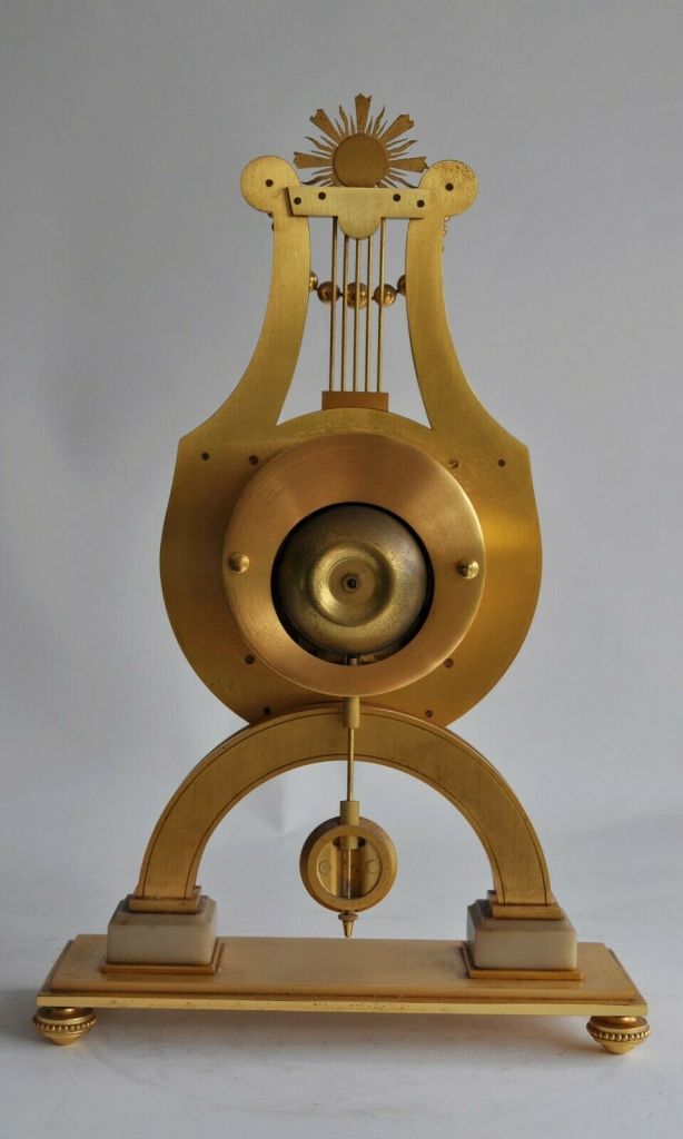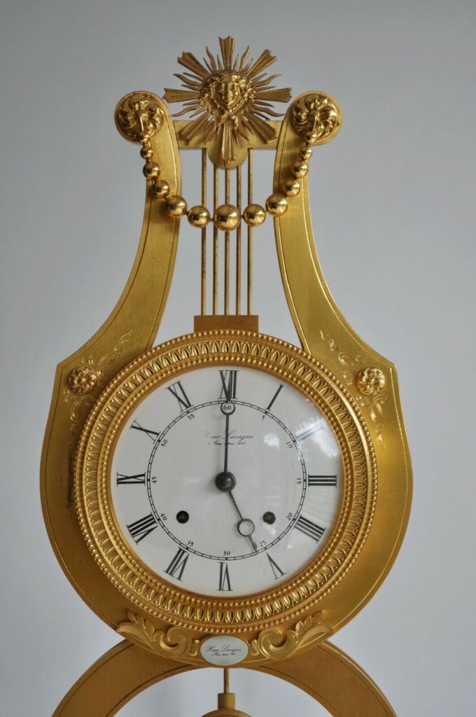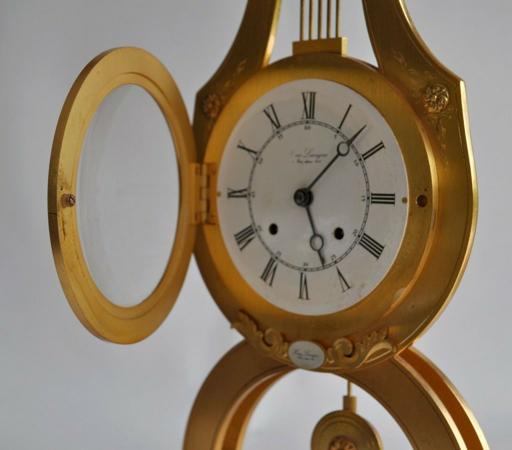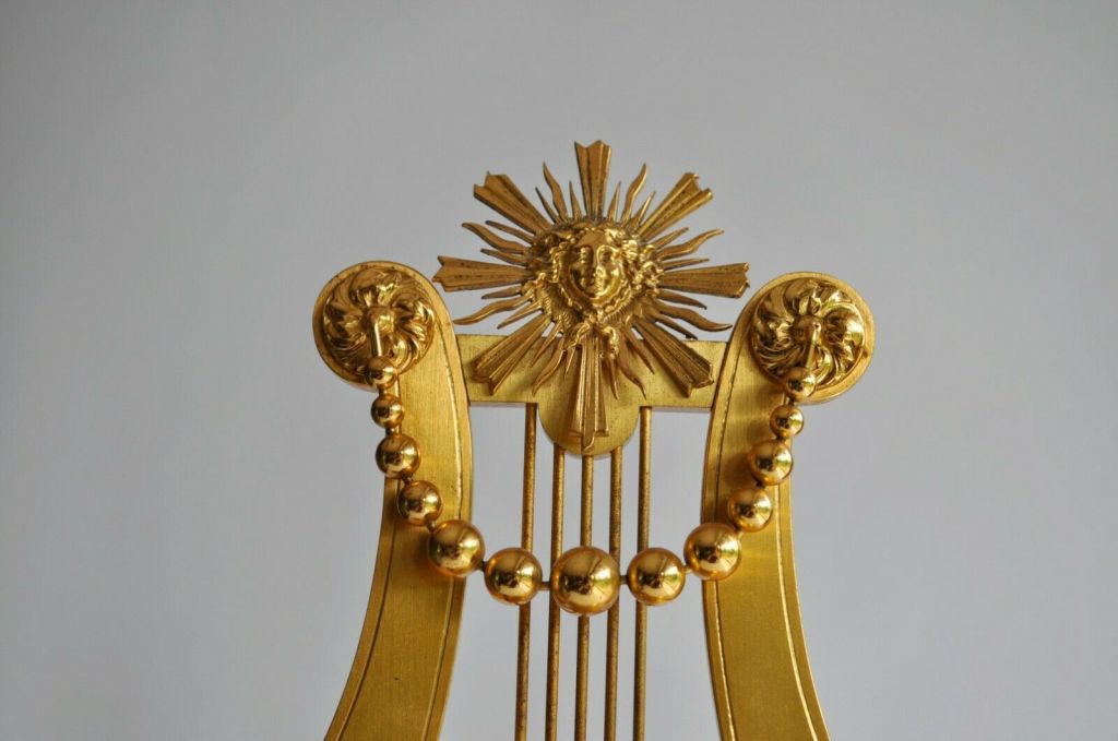Horloge à poser , forme lyre , médaillon Soleil louis XIV , chiffres romains , chemin de fer rond numéroté à l’intérieur de la zone des heures , cadran blanc émaillé , mouvement mécanique à clef amovible et balancier en bronze , sonnerie aiguilles noires breguet , Hauteur 38.5 cm Largeur 24.5 cm