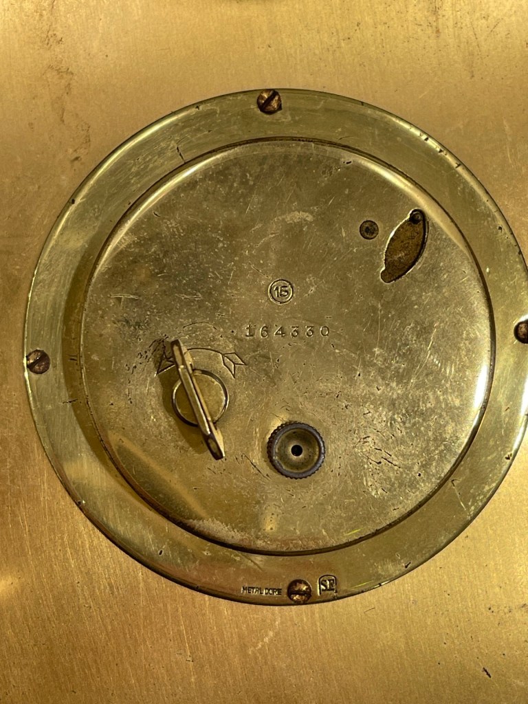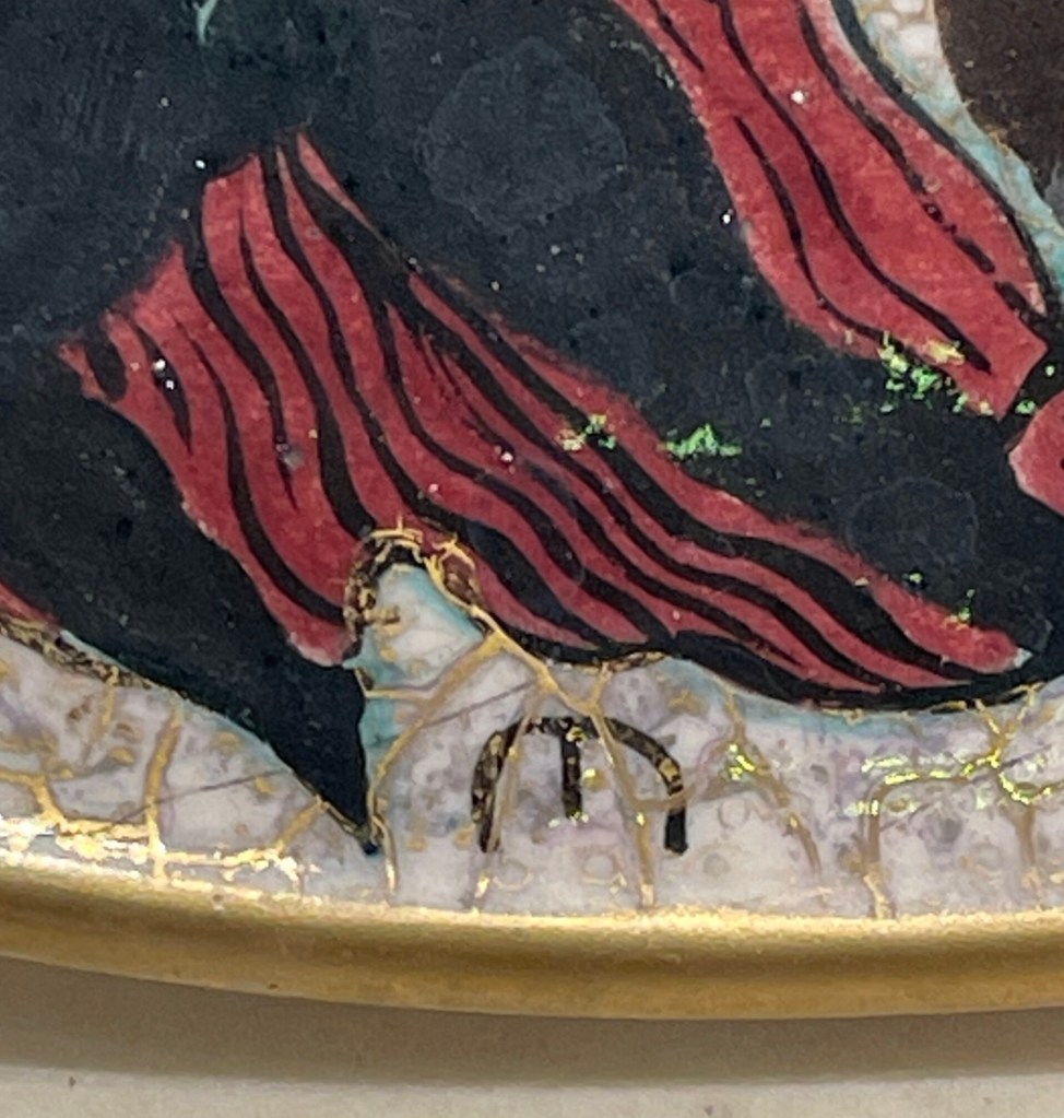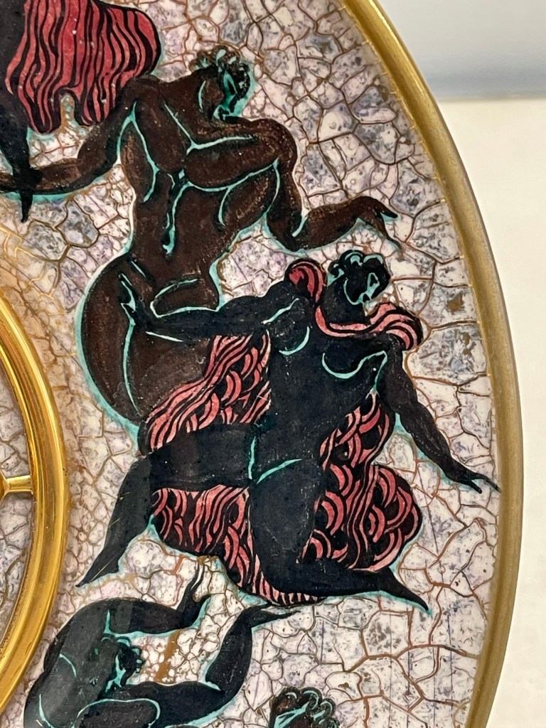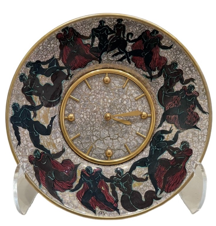 Pendule à poser ou suspendre en partie centrale Hour Lavigne montée sur un plat en céramique réalisé par Mayodon. Le décor représente une scène de danse de couples à l’Antique typique des années 1940 et 1950. Le décor est réalisé en émaux polychromes noir, rouge, vert, complété de rehauts d’or. Les aiguilles glaives et le cadran sont en laiton doré, pas de chiffres mais des index dont quatre plots ronds cardinaux . Le monogramme de Jean Léon Mayodon est présent en partie inférieure du décor et la signature d’Hour Lavigne est présente sur le mécanisme. Mouvement mécanique 15 jours . Jean Léon Mayodon a réalisé un modèle similaire pour le joaillier Cartier à New York dans les années 1950 où l’on peut retrouver un décor en émail et or de femmes nues dansantes. Mayodon est un des plus célèbres céramistes français des années 1940, 1950 connu pour ses représentations néoclassiques. Diamètre : 26cm
